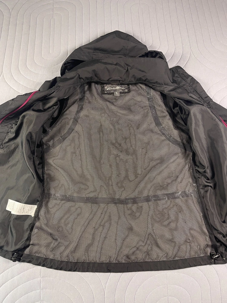 The product is a women's rain jacket in size L, featuring a black and pink color scheme. This windbreaker style jacket is made of 100% polyester with a woven fabric type, making it lightweight and water repellent. It is hooded and lined with mesh material for added comfort. The mid-length jacket has a zip closure and multiple pockets for convenience. Perfect for travel, activewear, or casual occasions during the winter, fall, or spring seasons. Machine washable and suitable for various outdoor activities like hiking or running.