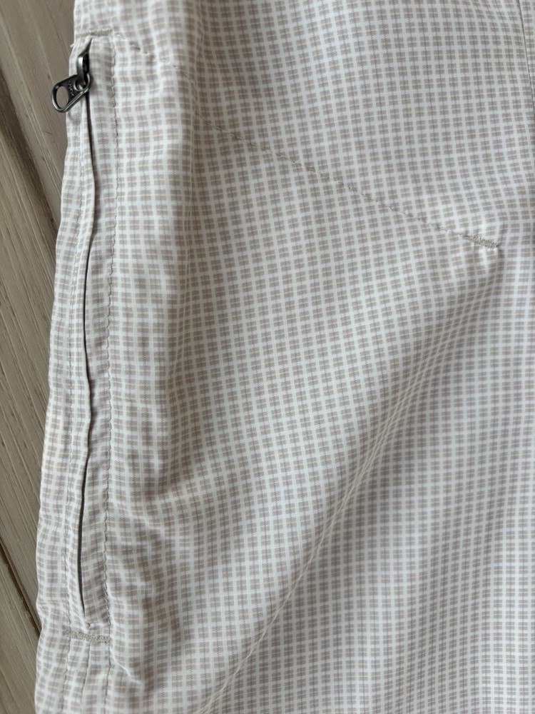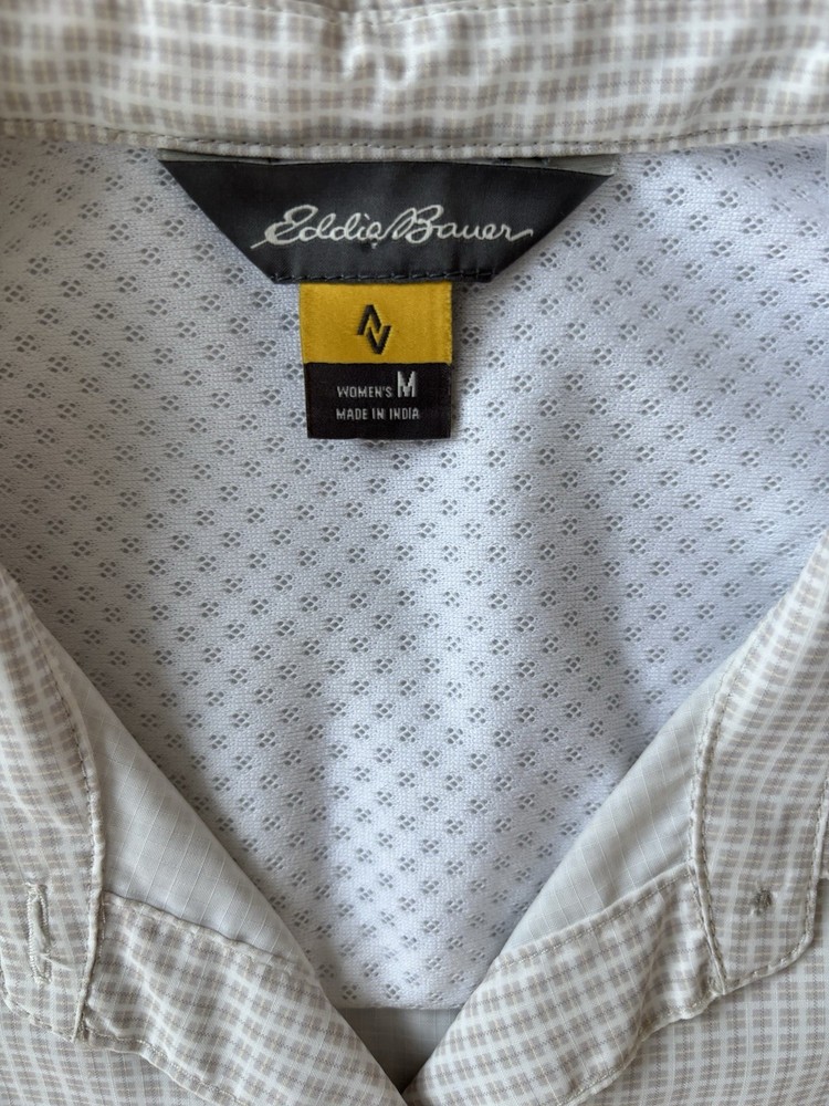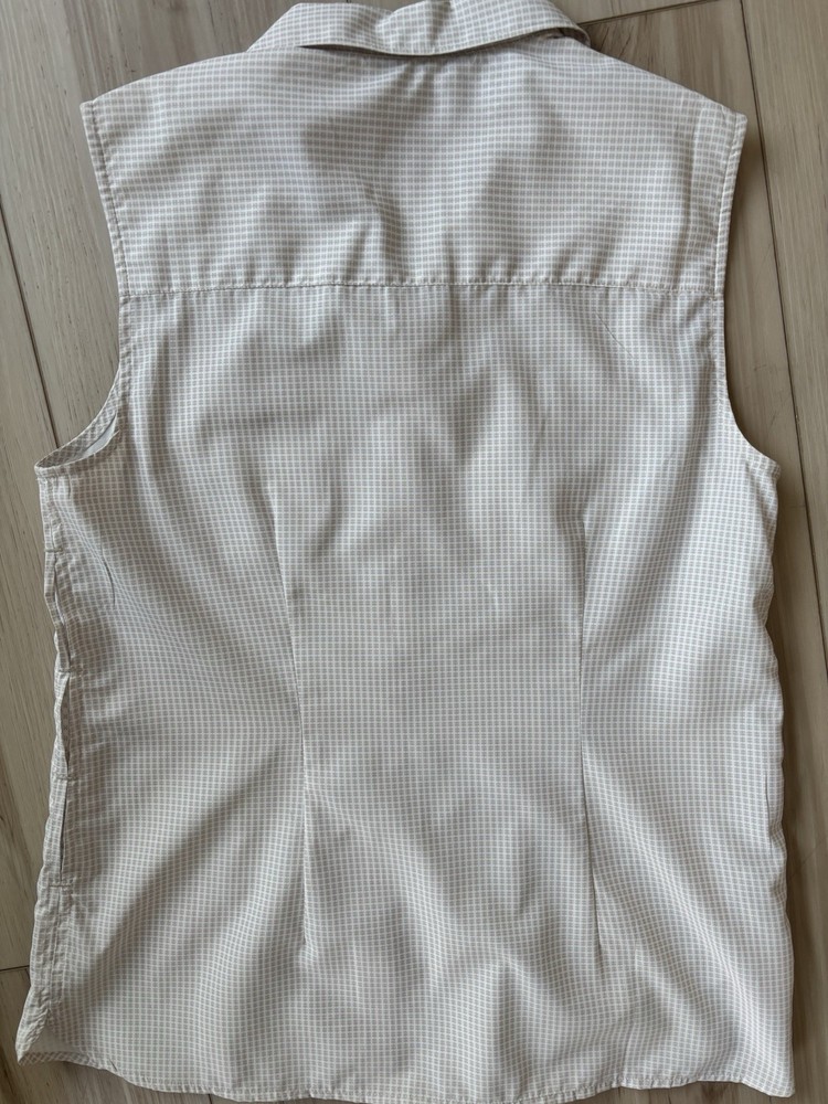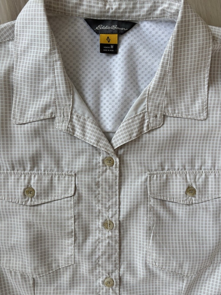 The Eddie Bauer Women's Sleeveless Collared Button Down Shirt in Beige White is a versatile and stylish top perfect for travel or casual occasions. Made from lightweight polyester with a down fabric type, this shirt features a polka dot pattern, button closure, and strappy sleeves for a comfortable fit. The collared neckline and chest pockets add a touch of sophistication, while the zippered side pocket and breathable material make it practical for everyday wear. Ideal for a regular fit, this tank top by Eddie Bauer is a must-have for any outdoor-inspired wardrobe.