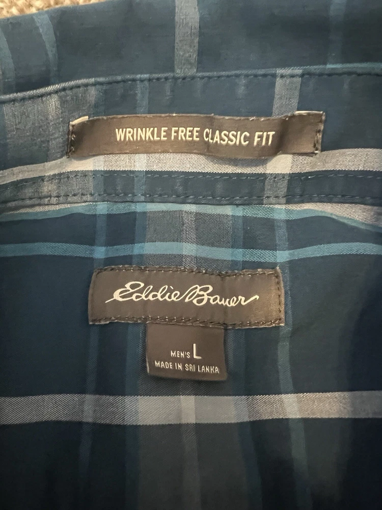 This Eddie Bauer button-down shirt is a must-have for any man's wardrobe. With a classic fit and wrinkle-resistant fabric, it's perfect for travel or casual occasions. The shirt features a blue plaid pattern, long sleeves, and a collared neckline with a button-down style. Made from comfortable cotton flannel, this shirt is machine washable and easy to care for. It also includes convenient pockets and is suitable for all seasons. The shirt is a size L with a colorful, outdoor theme making it a great addition to any outfit.