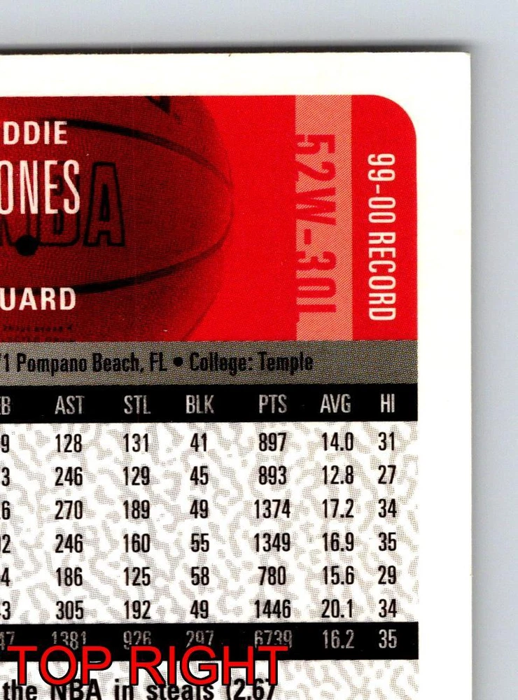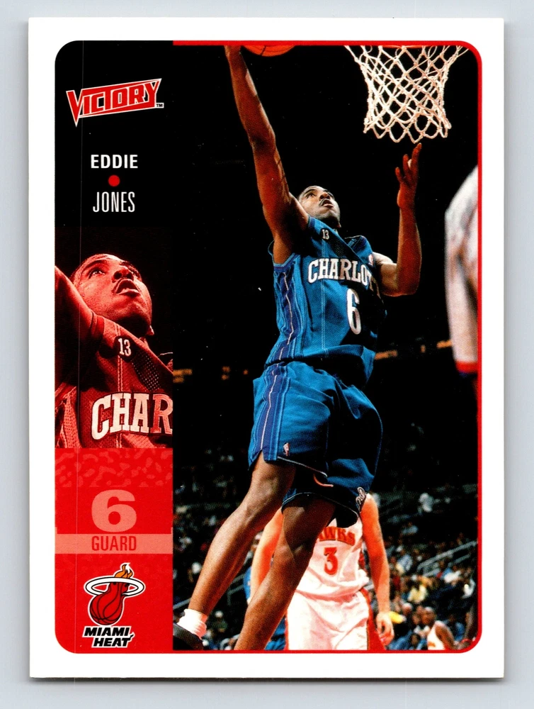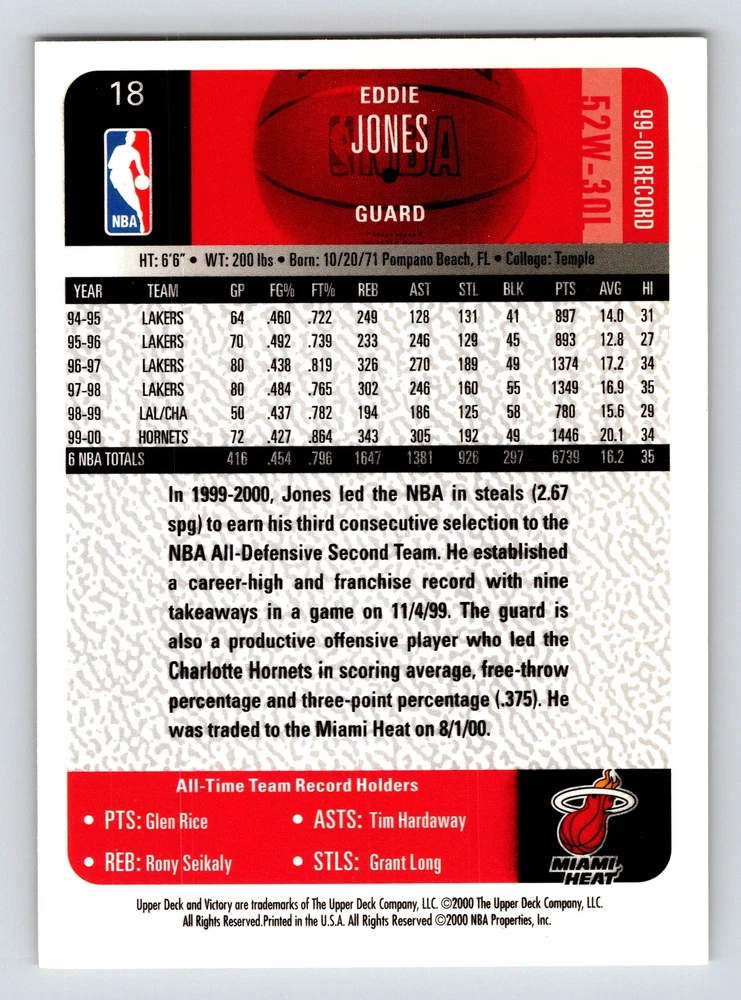 Item Description Title: Eddie Jones Guard Miami Heat Victory 1999 2000 Card 18 Basketball Memorabilia Description: This sports trading card features Eddie Jones, a notable guard known for his impressive career in the NBA. The card is part of the 1999-2000 Victory series, produced by Upper Deck, highlighting one of the most dynamic players of the era. Jones played for the Miami Heat during this season, after stints with the Los Angeles Lakers and the Charlotte Hornets. Standing at 6'6 and weighing 200 lbs, Eddie Jones was recognized for his defensive prowess, leading the league in steals and earning repeated selections to the NBA All-Defensive Second Team. The card showcases Jones in action, capturing his agility and skill on the court. His statistics on the back reflect his outstanding contribution to the teams he played for, making this card a sought-after piece for basketball enthusiasts and collectors. MRSP: $4.99 Sport: Basketball Player/Athlete: Eddie Jones Season: 1999-2000 Manufacturer: Upper Deck Parallel/Variety: Unknown Set: Victory 1999-2000 Team: Miami Heat League: National Basketball Association (NBA) Card Number: 18 Counter: 279 Folder: BASKETBALL1224002