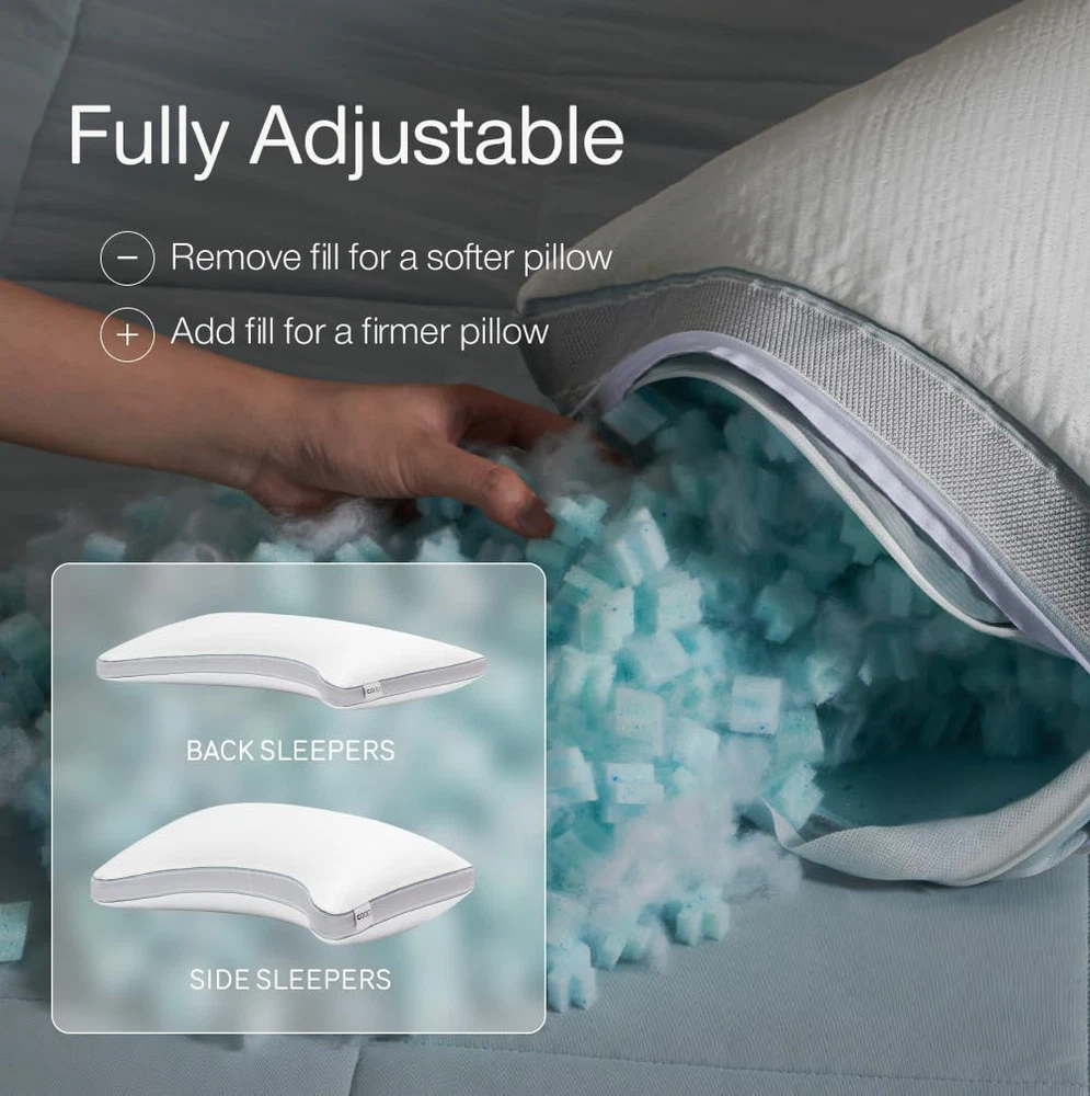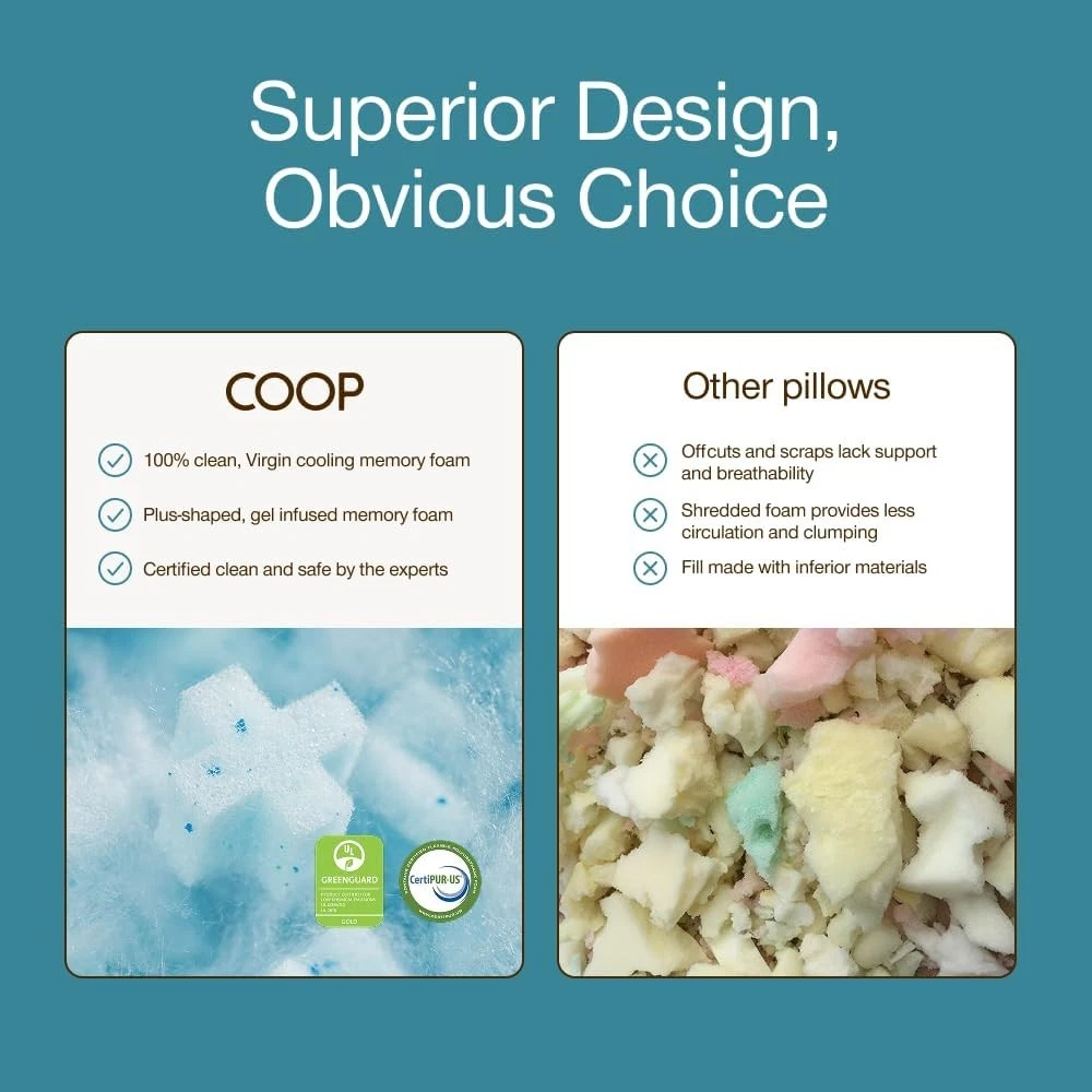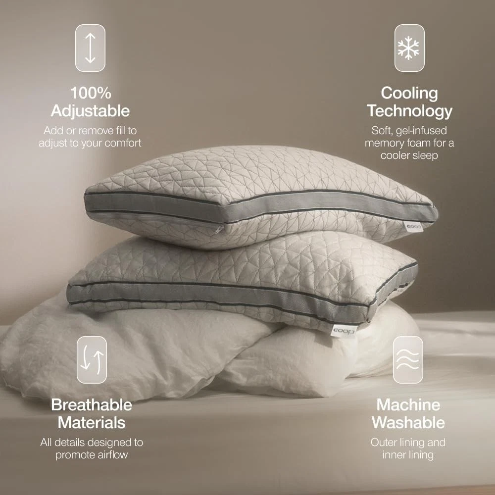 Product description Sleep fresh and comfy with our ultra-soft, breathable pillow cover that helps regulate temperature for all-night cozy comfort. Customize loft and firmness to your perfect comfort level and keep it fresh with an easy-to-clean, removable, machine washable cover. Wake up feeling fresh each morning with our gel-infused memory foam blend, offering plush comfort and adaptive neck and head support. The 2-inch gusset design keeps fill evenly distributed, delivering consistent, edge-to-edge support for every sleep position. Previous page Next page 1 Adjustable 2 Oomph AC Fill 3 Choose Your Level of Cool Find Your Perfect Coop Pillow Eden Buying Options Original Add to Cart Cool+ Add to Cart Crescent Add to Cart Cut-Out Add to Cart Maternity Pillow Buying Options Body Pillow Buying Options Customer Reviews 4.3 out of 5 stars 14,401 4.4 out of 5 stars 64,279 4.3 out of 5 stars 14,401 4.4 out of 5 stars 64,279 4.4 out of 5 stars 64,279 4.4 out of 5 stars 3,066 4.4 out of 5 stars 3,066 Price $84.00 $ 84 . 00 $62.90 $ 62 . 90 $105.85 $ 105 . 85 $73.26 $ 73 . 26 $73.26 $ 73 . 26 $79.20 $ 79 . 20 $79.20 $ 79 . 20 Size Queen Queen Queen Queen Queen Full Body Full Body Perfect For Back, Stomach and Side Sleeper Back, Stomach and Side Sleeper Back, Stomach and Side Sleeper Side and Back Sleeper Side Sleeper Side Sleeper Side Sleeper Dimensions 17" x 27" 19" x 29" 17" x 27" 18" x 28" 18" x 28" 9" x 60" 20" x 54" Fill Type Memory Foam With Cooling Gel Cross-cut Memory Foam Plus-Shaped Gel Memory Foam Cross-Cut Memory Foam Cross-Cut Memory Foam Cross-Cut Memory Foam Cross-Cut Memory Foam Customizable Comfort ✔ ✔ ✔ ✔ ✔ ✔ ✔ Extra Fill Included ✔ ✔ ✔ ✔ ✔ ✘ ✘ Machine Washable Cover ✔ ✔ ✔ ✔ ✔ ✔ ✔ Certifications CertiPUR-US & Green Guard Gold CertiPUR-US & Green Guard Gold CertiPUR-US & Green Guard Gold CertiPUR-US & Green Guard Gold CertiPUR-US & Green Guard Gold CertiPUR-US & Green Guard Gold CertiPUR-US & Green Guard Gold On Nov 27, 2025 at 23:09:37 PST, seller added the following information: On Jan 15, 2026 at 00:16:51 PST, seller added the following information: