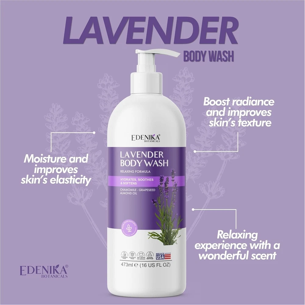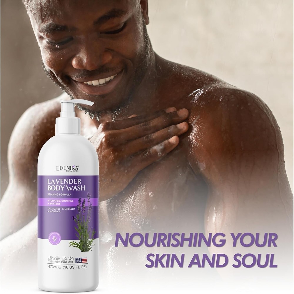 Relaxing Lavender Formula – Infused with calming Lavender, this body wash transforms your shower into a spa-like experience, helping to relax your mind and body. Nourishing Blend of Natural Oils – Enriched with Chamomile, Grapeseed, and Almond Oil, it helps hydrate, smooth, and improve skin texture for a radiant, healthy glow. Vegan & Free from Harsh Chemicals – This sulfate-free, paraben-free, and cruelty-free formula is made with certified organic ingredients, ensuring a clean and gentle cleanse for your skin. Safe for All Skin Types – Ideal for sensitive and delicate skin, this body wash works as a natural hydrator to nourish and moisturize without irritation, suitable for both men and women. Eco-Friendly & Made in the USA – Crafted with sustainable packaging and certified organic ingredients, this body wash is made in the USA and encourages environmentally friendly practices.