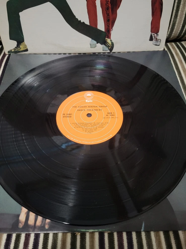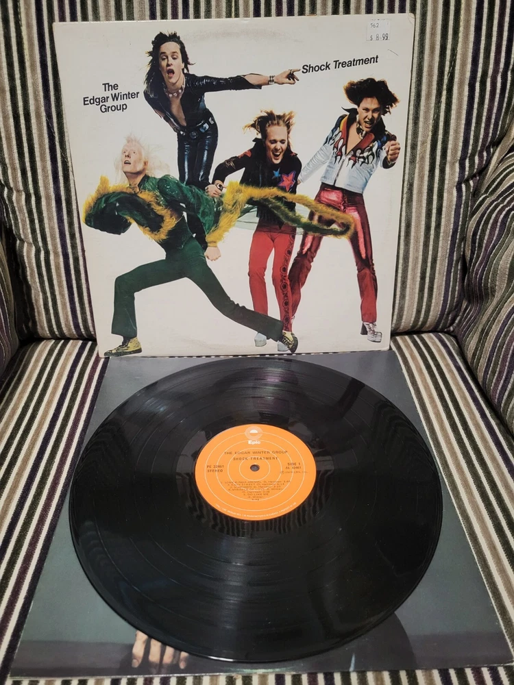 This Edgar Winter Group album, titled "Shock Treatment," is a first edition, first pressing LP vinyl record released in 1974 by Epic. The record features 33 RPM speed and is in near mint (NM or M-) grading. The excellent (EX) inlay and sleeve grading adds to the overall high-fidelity listening experience. The album is a great addition to any collection and features original inner sleeve and cover. The folk rock, country rock, and 1970s style makes it a must-have for fans of pop, rock, and country genres. This Canadian-made record is a gem for any vinyl record collector. The crazy thing about this album is the cover jacket and the cardboard record sleeve. They look female but sound like country folk....