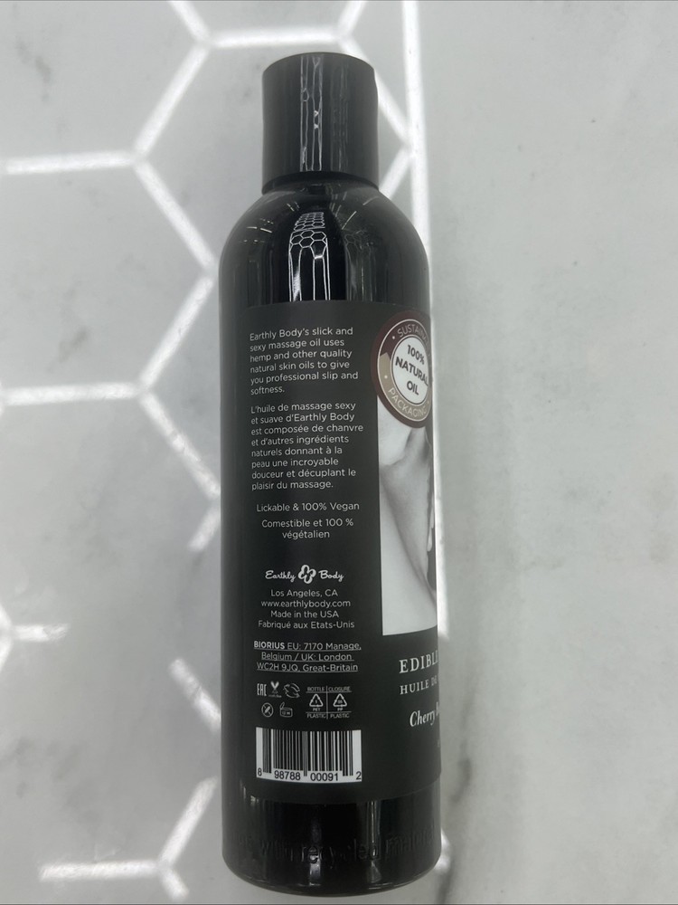 Edible Massage Oil Flavor - Cherry Earthly’s Body’s Slick & Sexy Massage Oil Uses Hemp & Other Quality Natural Skin Oils To Give You Professional Slip & Penetrating Softness. Lickable & 100 % Vegan 8 Fl Oz. / 237 mL