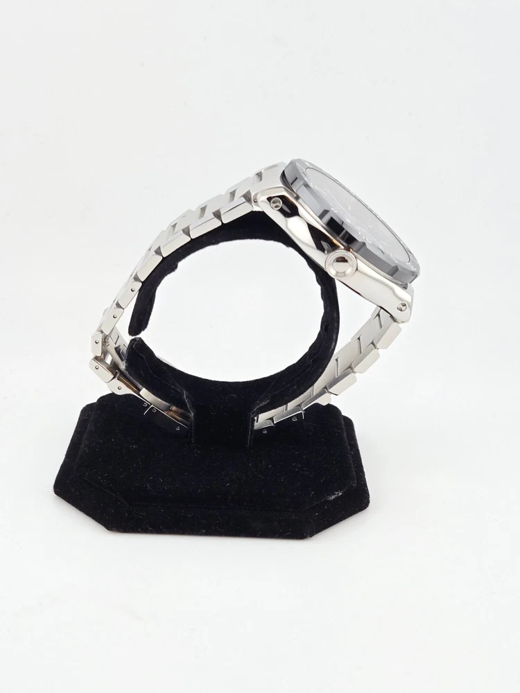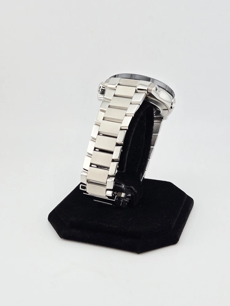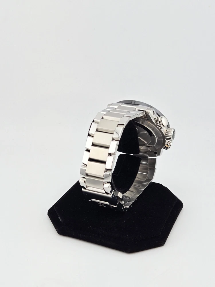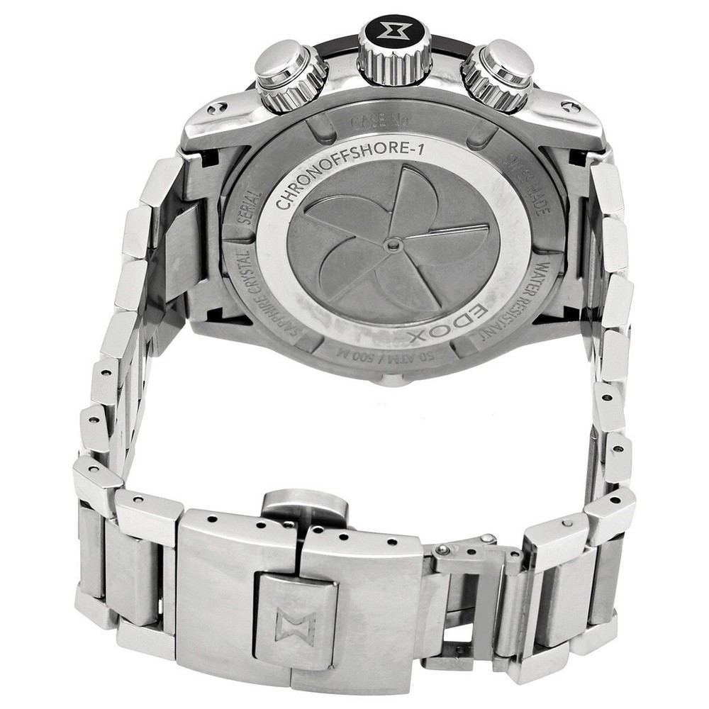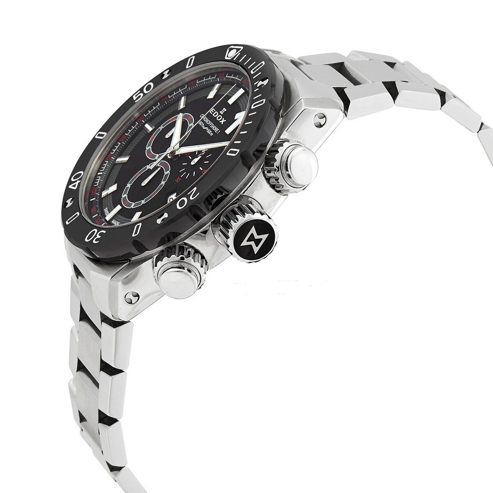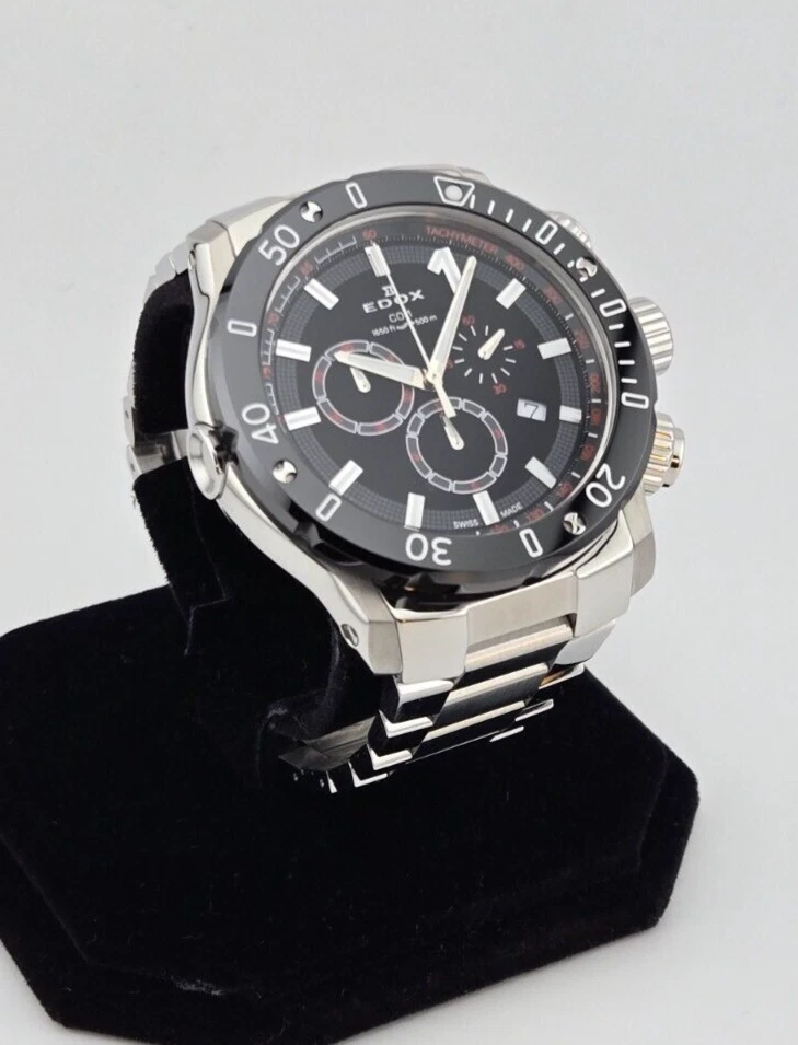 Edox Chronoffshore-1 Men's Black Dial Chronograph Watch 10221 3M NIN $1860 MSRP With Gift Box! This watch is a Shelf Pull from one of the Major Department Stores. Watch has micro scratches on the watch case/band, visible under direct light. Experience the perfect combination of ruggedness and precision with the Edox Chronoffshore-1 Men's Chronograph Watch. Crafted from durable stainless steel, this watch features a robust case and a matching stainless steel bracelet, making it ideal for both adventurous outings and everyday wear. The uni-directional rotating black ceramic bezel adds a modern touch, while the striking black dial showcases luminous silver-tone hands and index hour markers for easy readability in any lighting. The Edox Chronoffshore-1 is designed for performance, equipped with a reliable quartz movement that ensures accurate timekeeping. Its chronograph function includes three sub-dials that display 60 seconds, 30 minutes, and 12 hours, providing you with essential timing capabilities. The date display at the 4 o'clock position adds practicality to its sophisticated design, while tachymeter markings around the outer rim offer additional functionality for speed calculations. With a case size of 45 mm and a thickness of 13 mm, this watch commands attention without compromising comfort. The scratch-resistant sapphire crystal ensures durability, and the solid case back enhances its robustness. Designed to withstand aquatic adventures, the watch is water-resistant up to 300 meters (1000 feet), making it perfect for diving and water sports. The deployment clasp provides a secure fit, ensuring that the Edox Chronoffshore-1 is not just a watch but a reliable companion for any journey. Features Stainless steel case with a stainless steel bracelet. Uni-directional rotating black ceramic bezel. Black dial with luminous silver-tone hands and index hour markers. Minute markers. Tachymeter markings around the outer rim. Dial Type: Analog. Luminescent hands and markers. Date display at the 4 o'clock position. Chronograph - three sub-dials displaying: 60 second, 30 minute and 12 hour. Quartz movement. Scratch resistant sapphire crystal. Screw down crown. Solid case back. Round case shape. Case size: 45 mm. Case thickness: 13 mm. Band width: 25 mm. Deployment clasp. Water resistant at 300 meters / 1000 feet. Functions: chronograph, date, hour, minute, second. Fast and Free Shipping You're already purchasing the item. Why pay additional for shipping, especially slow shipping? We get your order shipped out within 1-business day and delivered to your doorstep as quickly as possible. Competitive Pricing With our dynamic pricing model, our prices are always competitive. Our prices are some of the lowest that you will find on the internet. Rest assured that you're getting a good deal when purchasing with us. 30-day Money Back Guarantee We are committed to making sure that you leave this transaction satisfied. If you're unhappy with the product for any reason, you may return it back for your money-back or a replacement within 30 days. No questions asked!