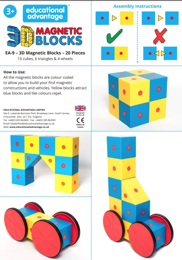This listing is for an old-stock item Sold as is no returns May have dust, watermarks, dustmarks, etc. Keep in mind there is an Shipping & handling Charge for this listing The first 4 images is the original item in this listing New, Good Condition No Box! Contents: 10 cubes, 6 right angled triangles, 4 pairs of wheels A fun way to explore construction using 3D magnetic shapes Yellow blocks attract blue blocks and like colours repel. Teaches the principles of magnetism. Cube blocks measure 5cm/2-inch. Create vehicles using the wheels included. Illustrated poster included.