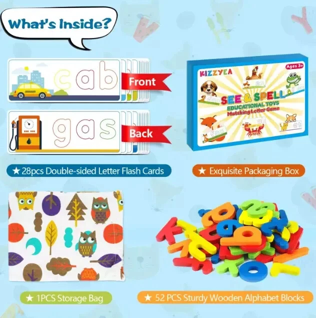 Educational Learning Toys for Girls Kids Toddlers Age 3 4 5 6 7 8 Years Old New US Warehouse - FREE & FAST Shipping in USA Product Description: Great STEM Educational Toy for Early Childhood Development: Sight Words are the first steps to reading. The set flash cards can not only help kids learn alphabet and numbers easily through playing this flash cards set, can develop hand-eye coordination, colors & shapes recognition and fine motor skills, which are great preschool activities and Montessori toys for toddlers. Great toddler STEM toys for 3-5 5-7 4-8 year old boys and girls. Fun Learning Resources for Toddler: Contains 28 double sided flash cards and 52 wooden blocks. With 56 rich scenes and 56 most commonly used Cvc sight words, help children develop memory and brain thinking by establishing connections. Build early shape, color, and alphabet recognition skills. As toddlers stack letter bricks onto the card, they improve their fine motor skills, become familiar with the letters of the alphabet, and soon learn to spell basic words like F-U-N! Safety and Environmental Material: early development toys are made to last. Sturdy wooden construction, premium craftsmanship, painted with water based non-toxic paint makes it parent's premium choice for educational toys for ages 3+. Larger-size wooden blocks can prevent the risk of suffocation of children. What's more, the wooden puzzle has smooth edges, fitting nicely into their small hands. Perfect gift for 3 4 5 6 year olds. Easy Store & Carry: The spelling game comes with a cute storage bag. When not playing, put the toy in bag, which will cultivate the children's hands-on ability. The compact packaging structure and light weight make it more convenient to hold. Place them in school bags and suitcases, suitable for many occasions, airplanes, cars, restaurants, etc. Provide a great opportunity to play, interact and communicate with your family. This ever-popular shape and color activity is sure to engage children. Best Choice Gifts for Kids Ages 3 4 5 6 : Whether you’re shopping for holidays, birthdays, or just because, toys from Learning Resources help you discover new learning fun every time you give a gift! This montessori toy makes the perfec Christmas / birthday / back to school / Easter / Halloween / New Year gift for 3-6 year old boys and girls. Customer satisfaction is our greatest motivation, please feel free to contact us if you have any problems about this alphabet flash cards set. Feedback: 1.Any question for your order, please contact us in time, we will reply to you within 24-48 hours and give you a satisfactory answer. 2.If you are satisfied with our products and services, hope to take up a little precious time to leave feedback reviews for our products.Thanks! 3.Your satisfaction is our effort. Welcome to order again! Have a great day! Our Policy: 100% Satisfaction Guarantee 30 Days Return and Refund Guarantee Free and Fast Shipping in USA, US Warehouse 15% of restocking fee will be charged for return it