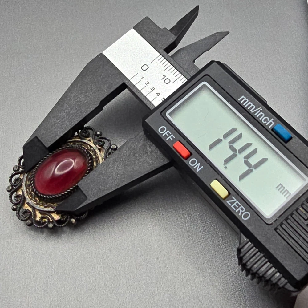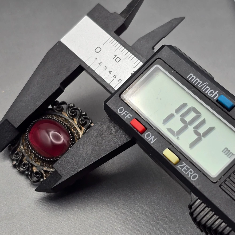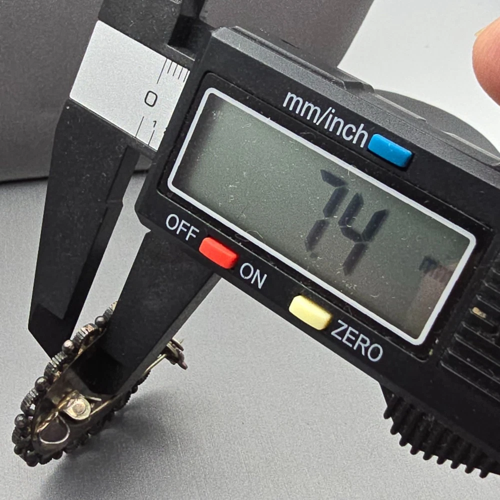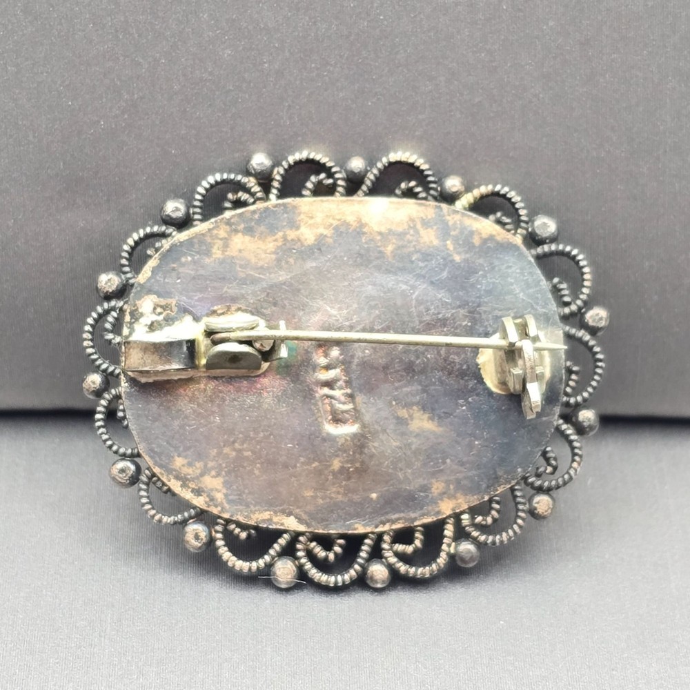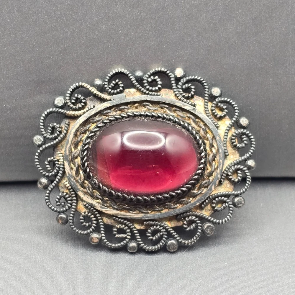 This antique brooch/pendant showcases a striking purple glass stone set within an ornate sterling silver frame. Its intricate wirework and vintage charm make it a distinct piece, ideal for adding a touch of elegance to any outfit. The brooch's timeless design is reminiscent of bygone eras, offering both historical allure and aesthetic appeal. • Features a secure clasp for easy attachment • Intricate metalwork detailing • Vintage charm with ornate design • Purple glass stone centerpiece • Unique wire pattern Features: • Marked STER • Unsigned • 19.4 mm Stones' Length • 14.4 mm Stones' Width • 7.4 mm Stones' Depth • Convertible Brooch/Pendant Jewelry, Intricate Wirework Size: Womens 1.5" x 1.25" Condition: Pre-Owned Good Good condition Gently used There may be some scratches due to normal use. Naturally, a darker type sterling silver, but there's still lots of natural patina. Please review all descriptions and photos closely before purchasing, thank you! Smoke Free Workspace Please read the description for further details and measurements, Thank you!