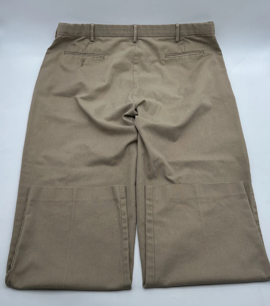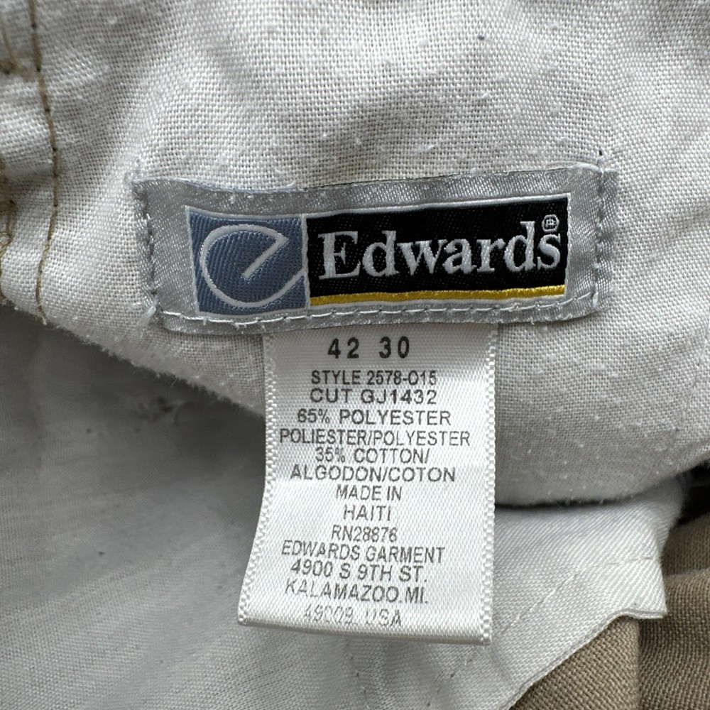 Elevate your style with these classic Edwards dress pants, perfect for any occasion. The beige color and solid pattern give a timeless look, while the zip and button closures add a touch of sophistication. Made with a blend of polyester and cotton, these pants are comfortable and durable. These pants feature a coin pocket and are designed with a classic fit, making them ideal for any formal or business event. The inseam measures 30 inches, suitable for men of size 42. The pants also have accents such as buttons and zippers, adding to their overall appeal. Made in Haiti, these pants are a must-have for any fashion-conscious man. Check pictures For flaws and measurements