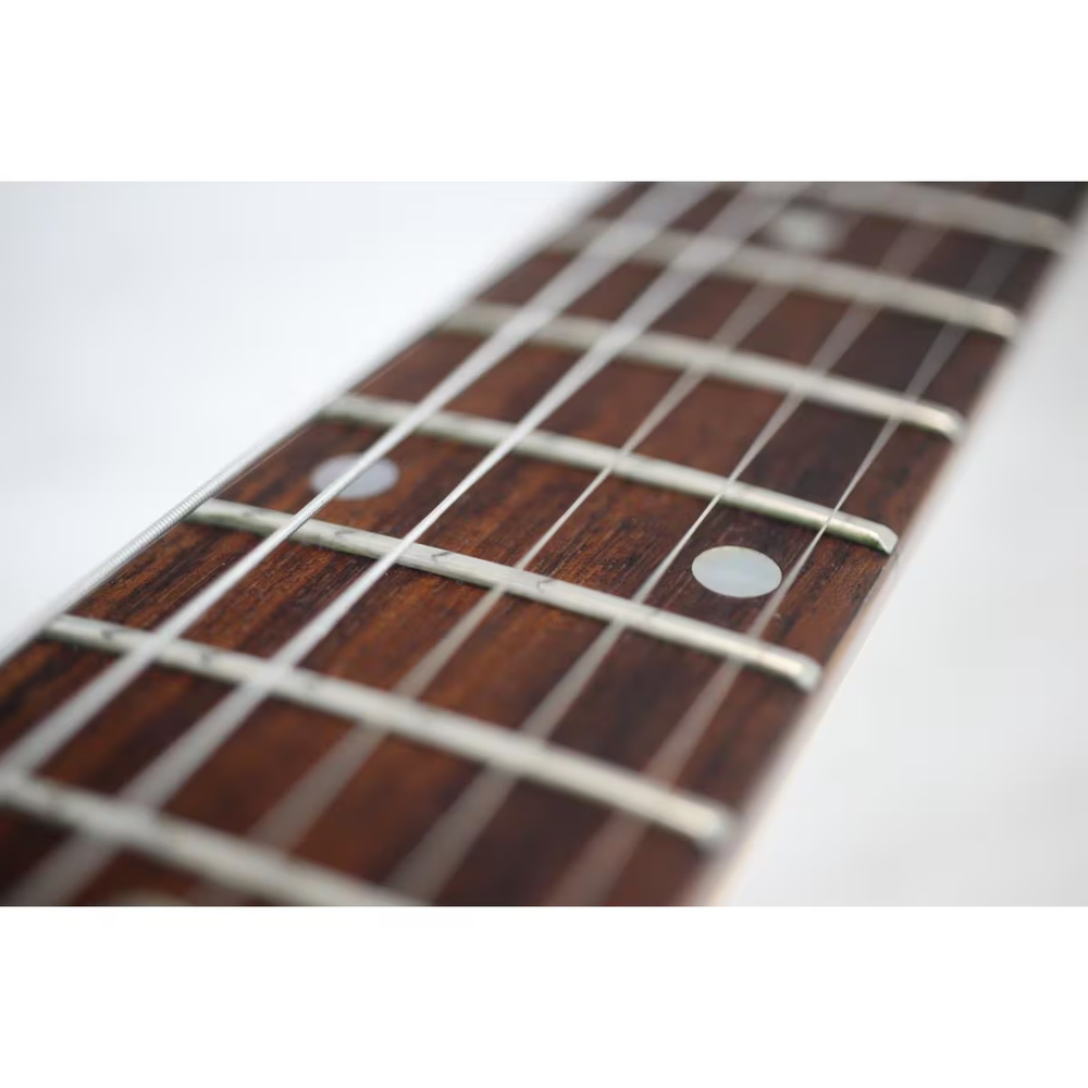 This guitar is an absolute gem for rock enthusiasts! The sleek white finish stands out, and the alder body with maple top delivers a crisp, balanced tone. The thin single-cut design feels great to play, and the HS pickups offer versatile sound—perfect for everything from clean melodies to gritty riffs. Despite minor wear, it plays smoothly with a solid neck and excellent truss rod adjustment. A rare find for collectors and players alike—don’t miss out!