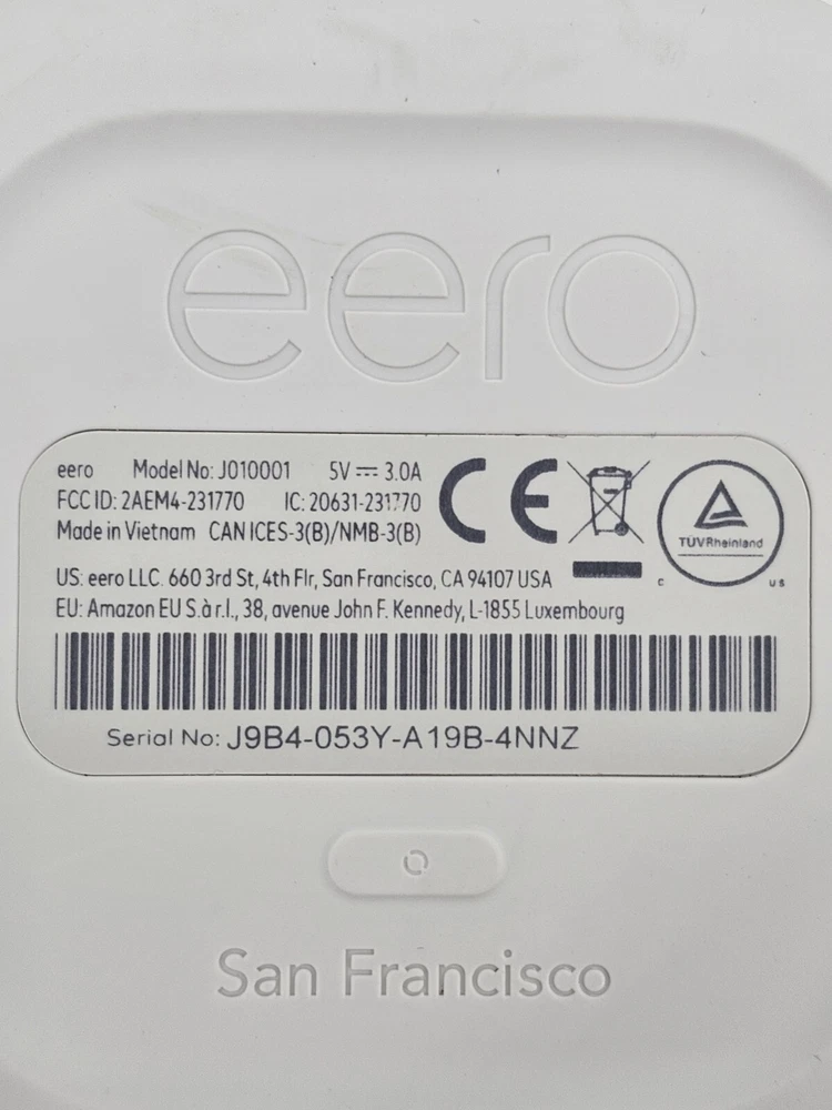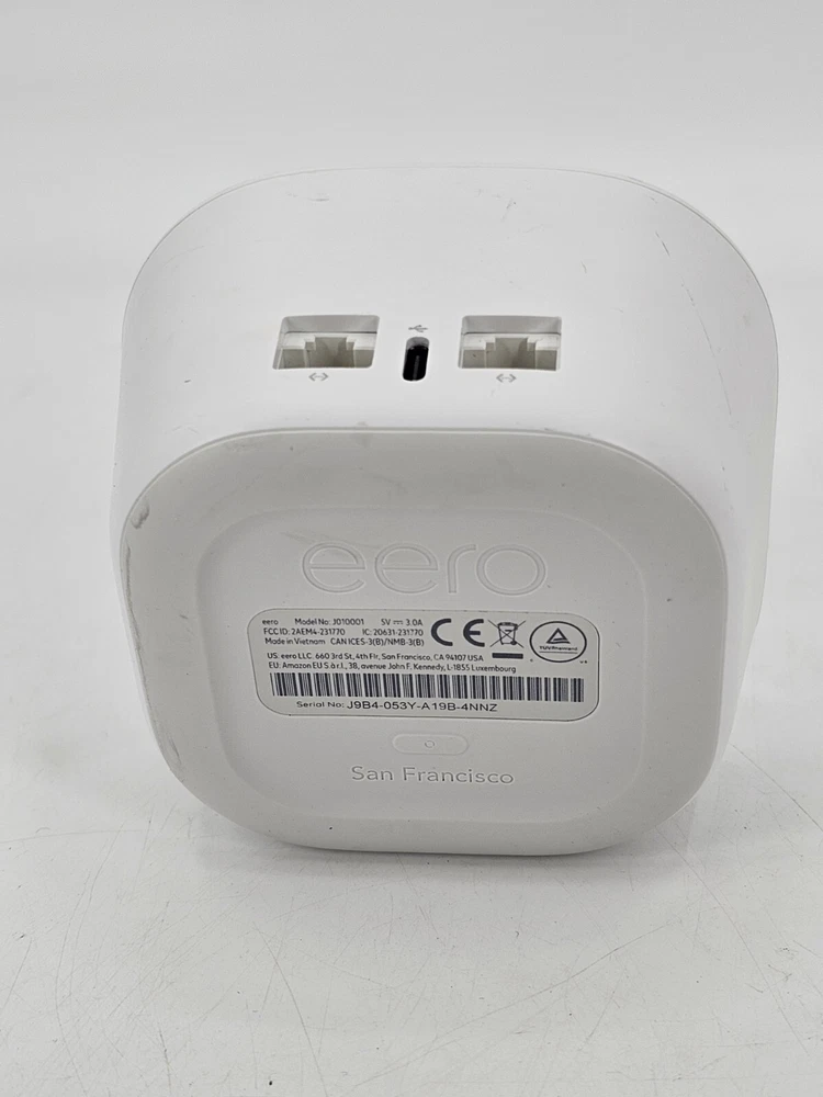 Color: White MPN: J010001 UPC: Does not apply Brand: Eero Type: Router Features: Dual-Band Number of LAN Ports: 2 Seller Notes: “PLEASE SEE PHOTOS FOR BETTER DETAILSUNIT ONLY” Connectivity: Wireless gtin13: Does not apply