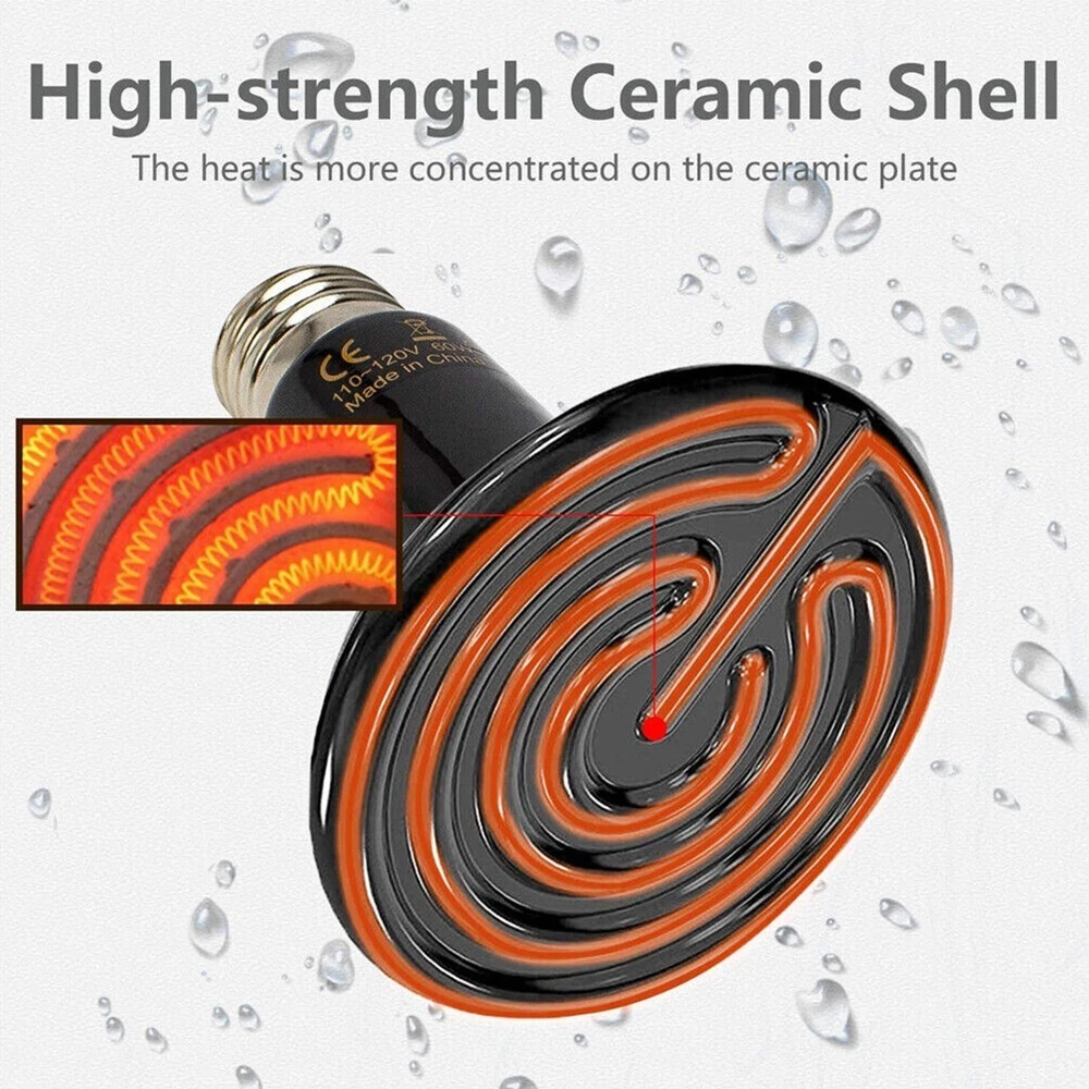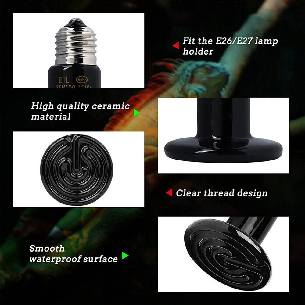 Effective Heat Source for Reptile Vivarium Ceramic Heat Lamp Emitter 200W DESCRIPTION Features: *Made of high quality materials, *Long lifespan: the ceramic heat emitter for use in standard E27 lamp base and easy to install, rated for up to 10, 000 hours *No light emitted: bulb does not emit any visually detectable light that can disturb the sleep cycle of your pets *pecification: Voltage: 220V-230V; Material: ceramic, metal, NiCrAl; To avoid scald, please wait at least 1 hour to cool down after turning off the bulb. High-purity ceramic ensures it remains crack-resistant and waterproof *Perfect 24 hours heat sources: great for reptile and amphibian terrariums, incubating poultry heater Specifications: Material: Ceramic Colour: Black Size: 7.5x11cm Power: 200w Voltage: 220V-230V Socket: E27 Package Contents: 2 x Ceramic Heat Lamp Note: 1. The real color of the item may be slightly different from the pictures shown on website caused by many factors such as brightness of your monitor and light brightness. 2. Please allow slight manual measurement deviation for the data. POLICES Shipping Payment WARRANTY We only ship to confirmed ebay Order addresses. Please comfirm that your Order address is in line with your shipping address. Please kindly note that the c ombined shipping is not provided because the shipping fee is calculated by weight. Also, the each additional item means exactly the the same color and size. It takes about 7 -15 working days to US; about 10-30 working days to other countries. Transit time may be a little delayed because of the bad weather and customs inspection . If you do not receive your item within 30 working days since payment finished, please contact us immediately for further assistance. Payment must be completed within 5 days. If you have any problems about payment, please contact us via ebay message. We strive for 100% customer satisfaction! Positive Feedback is very important to us. If you have any questions, p lease feel free to contact us via "Ask seller a question" . We will reply your email within 24 working hours.