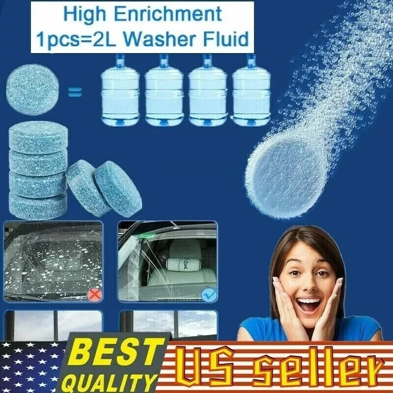 12Pcs Features: Color: Blue(shown in the pictures) Special Features: Car window cleaning Material Type: concentrate Item Weight: 2G Packing quantity: 10pcs concentrated wiper tablets Turns regular water into powerful cleaning fluid, one tablet in 2 L water will equal to 2 L windshield washer.More conveniently and easily to use than traditional windscreen cleaner.Dissolve thoroughly, no residual and apply for all metal, rubber, plastic and painted surfaces.Environmental friendly, biodegradable, phosphate and fragrance free formula.Very effective at removing bug splatter, bird droppings, tree sap and road grime from your windshield.Mixable with anti-freezing agent, for improved cleaning performance in winter.No measuring, no spills, no mess or plastic bottles to dispose of and no storage.Add directly to your reservoir or pre-mix in a separate container and top up as needed.You can even try it on mirrors and other glass surfaces that need to sparkle and shine. This product should be stored in a cool dry place to avoid contact with children. Do not swallow! Do not eat!This product can not be used for antifreeze glass water! Only the cleaning function does not have antifreeze function. 12Pcs