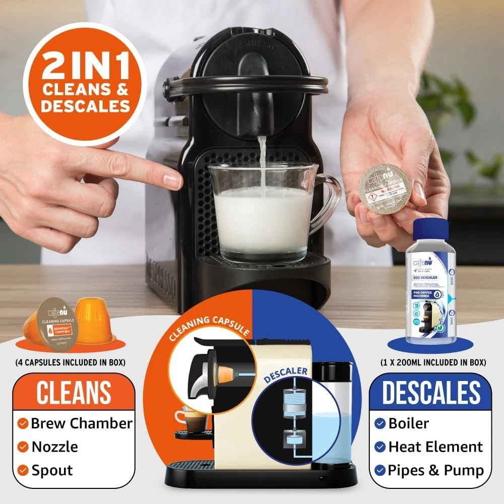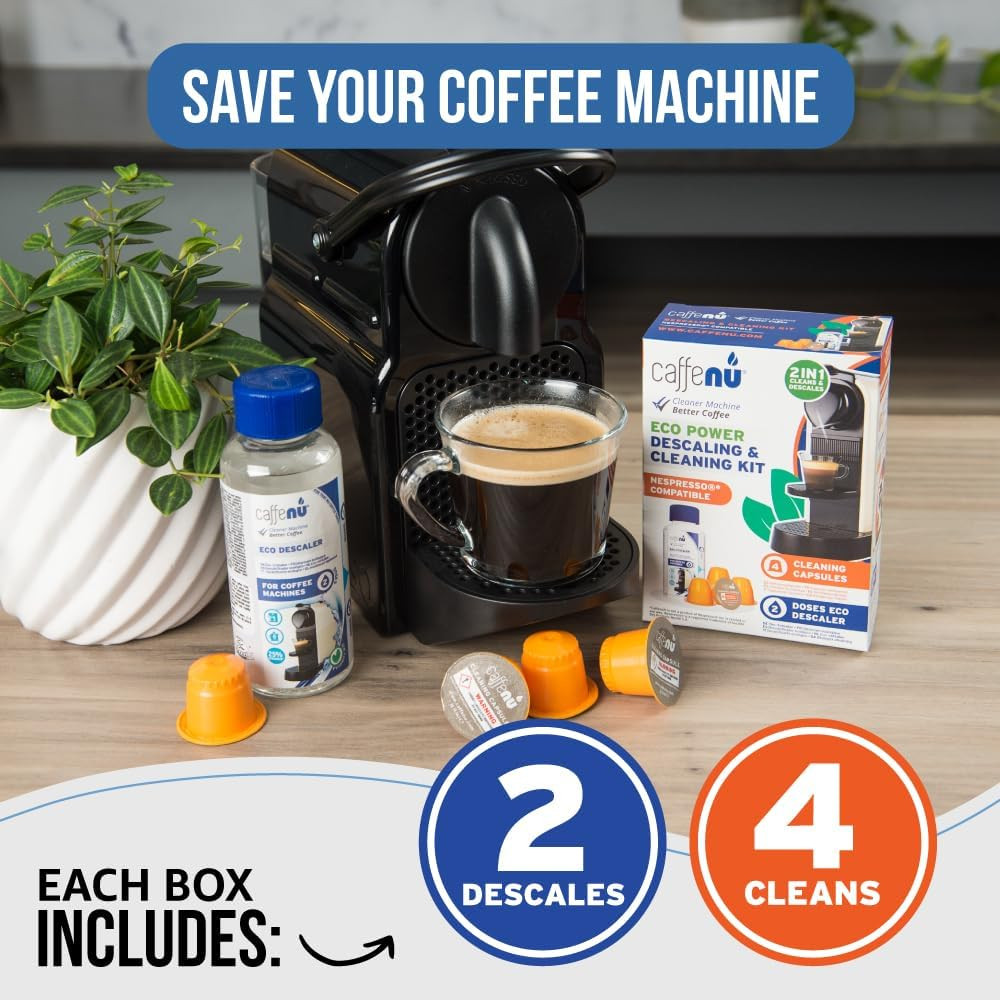 Nespresso Compatible Descaling Kit & Cleaning Pods. 2 Use Descaling Solution & 4 Cleaner Pods. Removes Limescale & Cleans Pod Area. Better Tasting, Hotter Coffee. Nespresso Originaline. Product Details Package Dimensions : 5.51 x 4.02 x 2.2 inches; 6.46 ounces Item model number : TM-CFCK-NC01 Material Feature : Biodegradable Warning Manufacturer : Caffenu Brand: Caffenu Item Form: Capsule Scent: Espresso Specific Uses For Product: Coffee Machines Material Feature: Biodegradable CLEAN YOUR MACHINE & EXTEND ITS LIFE: Our Concentrated Descaling Solution Formula removes limescale and mineral deposits from your machine to maintain its internal components so it runs smoothly for a long time; It also prevents corrosion; It is compatible with Nespresso Originaline Machines; Not compatible with Vertuo Line machines ☕ IMPROVES TASTE: Have your coffee and teas tasting better by cleaning your beverage appliances USE IT IN ALL TYPES OF COFFEE MACHINES, KETTLES & URNS: Use this descaling solution in any brand or type of coffee or espresso maker; It's great as a Keurig descaling solution and compatible with ALL single-use coffee & espresso machines! It's also compatible with kettles and electric water heaters A MORE POWERFUL DESCALING FORMULA: Our Coffee Machine Descaler has a higher concentrarion of active ingredient which makes it more Powerful and effective in reaching the critical components of your coffee or espresso machine and getting rid of all calcium deposits; This concentrated descaling solution is made of plant-based Lactic Acid which makes it great for the environment; It will restore the performance of your machine; Exceeding the cleaning performance of other formulas