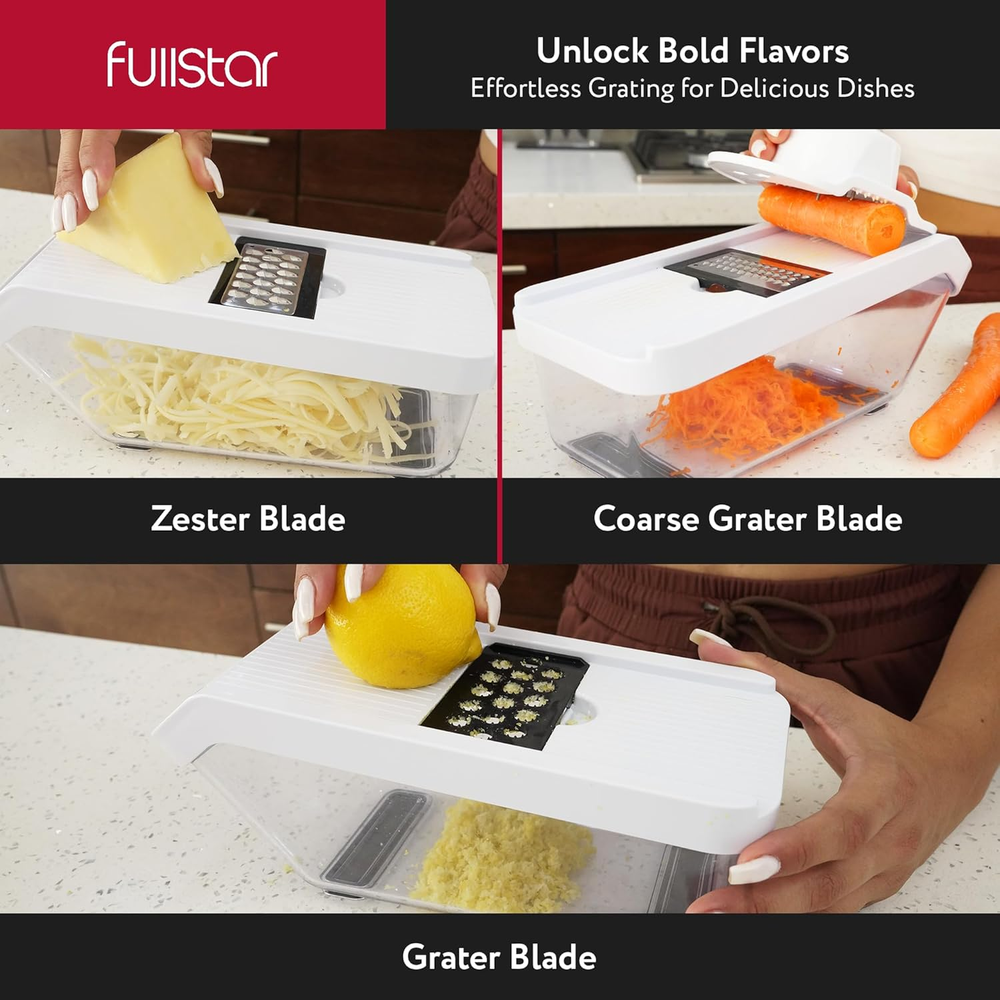 Convenient Pouring Veggie Slicer - Say goodbye to spills! Our dicer chopper's convenient pouring feature lets you easily add chopped veggies straight into your dish without lifting the lid or disassembling. This is the perfect food chopper with container for prepping salad bowls, stir-fries, and more. 8 Interchangeable Precision Blades - Comes with 2 chopping blades (fine and large dicer) and 6 slicing blades: julienne, coarse grater, fine grater, zester, slicer, and an exclusive wavy blade not found in other vegetable chopper with container. These versatile blades deliver precision to your kitchen for creating gourmet salads, perfectly diced vegetables, and decorative garnishes. Innovative Self-Cleaning Pusher Grid - No mess, no stress! Our onion chopper's innovative self-cleaning grid pushes food residue forward for easy removal from the blades. Prep with ease and clean up in seconds with Fullstar's innovative vegetable slicer. Large Catch Tray with Dual-Lid - The Fullstar vegetables slicer comes with a large 800ml capacity tray for easy ingredient collection. Easily switch between slicing and dicing using dual lids: one slim mandoline slicer and one robust chopper, each designed for specific blades. With this potato slicer, you get the perfect tool for every prep. Effortless Cleanup and Safe Storage - Our BPA-free cucumber slicer vegetable cutter comes with 2 cleaning scrapers, a cleaning brush, and a finger guard for safety. Plus, it's top-rack dishwasher safe! The included blade organizer ensures everything stays tidy and sharp, ready for your next culinary adventure. Fullstar 8 blade chopper and mandoline with pouring feature