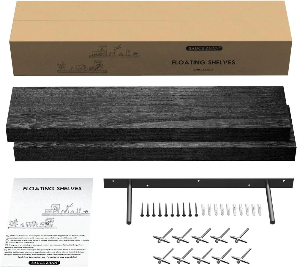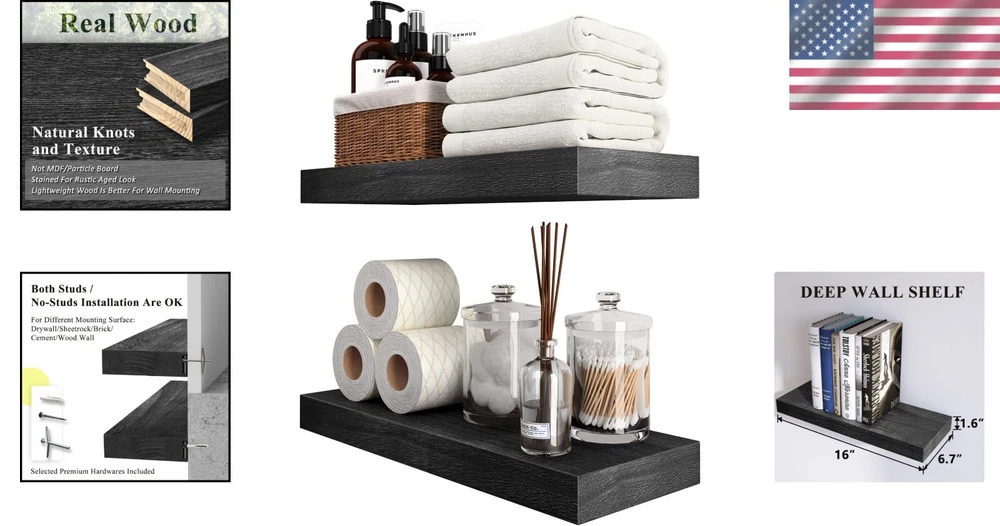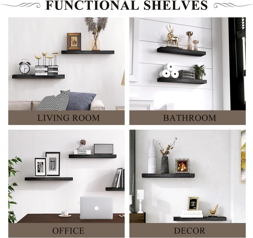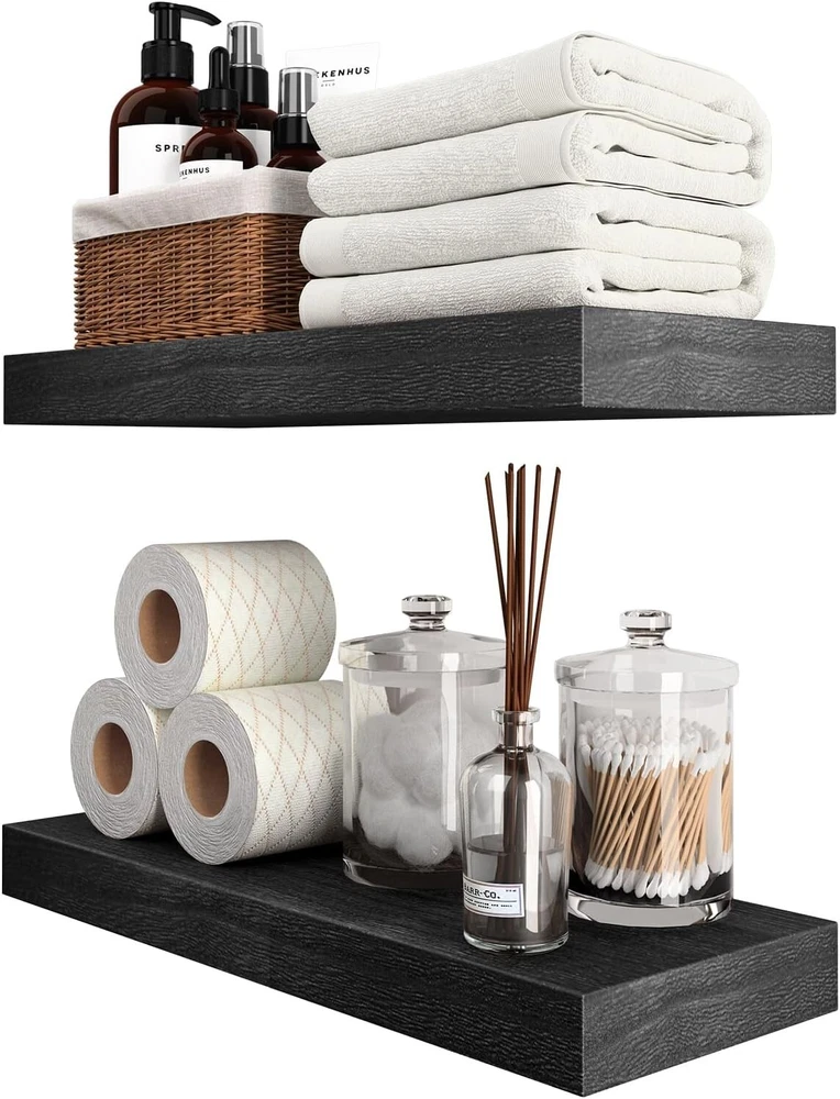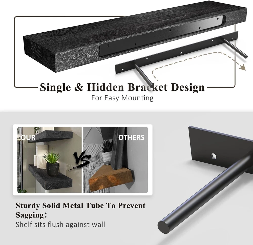 Specific Uses For Product: Decorative Storage In Various Rooms Of A Home Mounting: Wall Mounted Maximum Weight per Shelf: 20 lb Installation Type: Wall-mount Color: Black Age Range (description): Adult Product Care Instructions: Wipe With Dry Cloth Shape: Rectangle Item Width: 16 in Furniture Finish: Wood Recommended Uses For Product: Bathroom, Kitchen, Living Room, Bedroom Material: Wood Set Includes: Floating Shelf, Shelf Brackets Number of Shelves: 2 Included Components: Rod gtin13: Does not apply Maximum Weight Capacity: 50 lb Unit Count: 2.0 Count Size: 16 Inch Department: Adults Special Feature: Space Saving Brand: Unbranded Wood Tone: Light Wood Room Type: Office, Kitchen, Bedroom, Dining Room Item Weight: 5 lb Distance from Floor to Bottom: 6 in Room: Office, Kitchen, Bedroom, Dining Room Packaging: Flat Pack Suitable For: Decorative Storage Door Mechanism: Open Face Number of Items in Set: 2 Style: Rustic Item Length: Floating Shelves Item Height: Floating Shelves Number Of Items: 2 Required Tools: No Tools Required Product Dimensions: 6.7"d X 16"w X 1.5"h Finish: Unfinished Type: Floating Shelf Personalized: No Features: Space Saving, Sturdy, Secure, Effortless Installation, Stylish, Functional Finish Type: Unfinished Additional Parts Required: No UPC: Does not apply