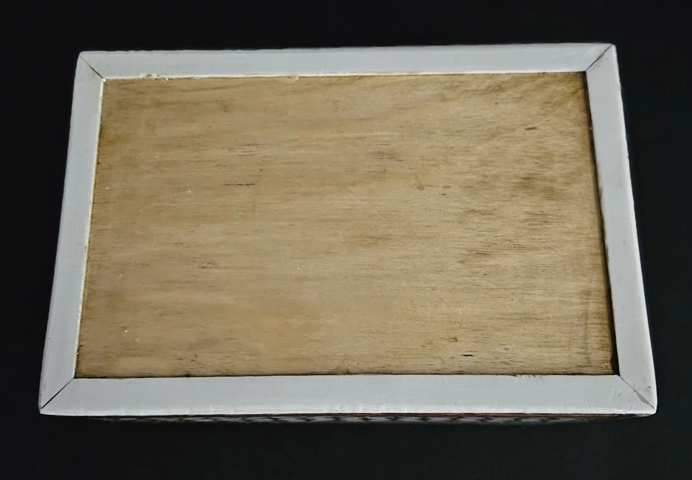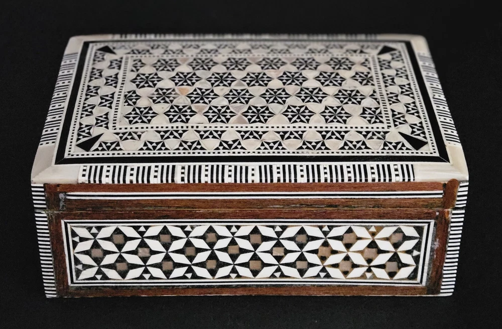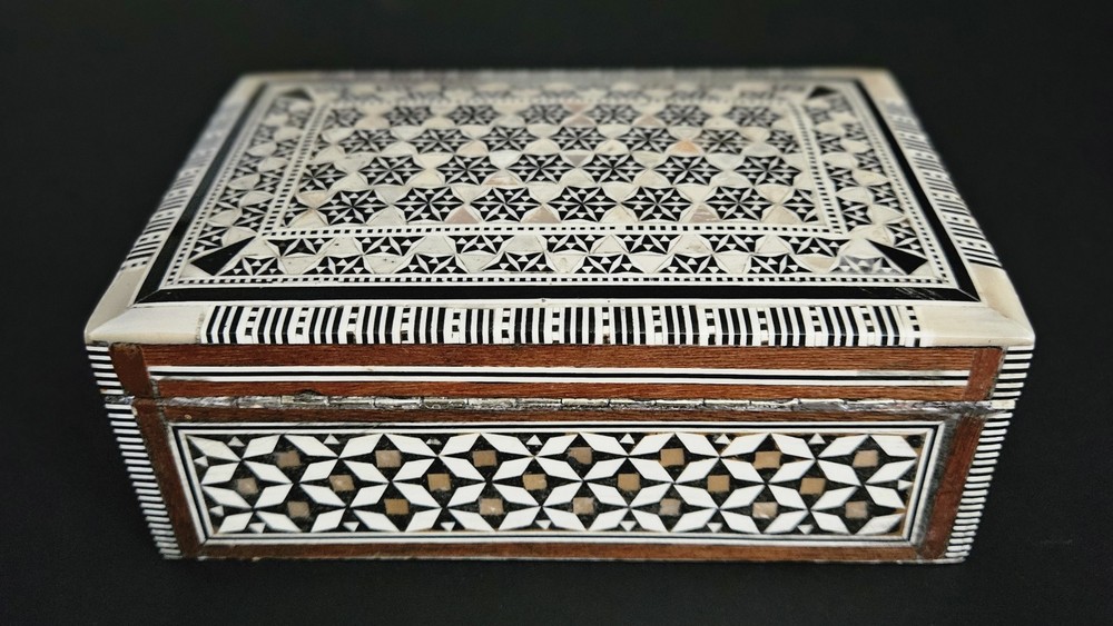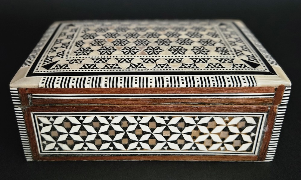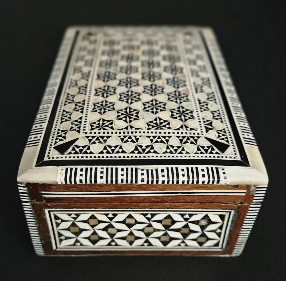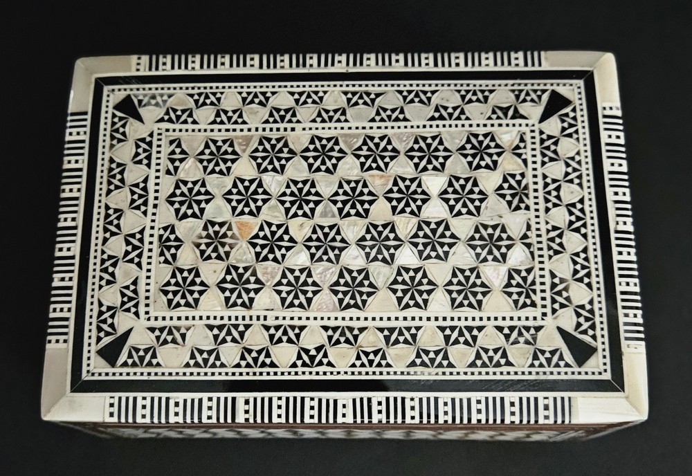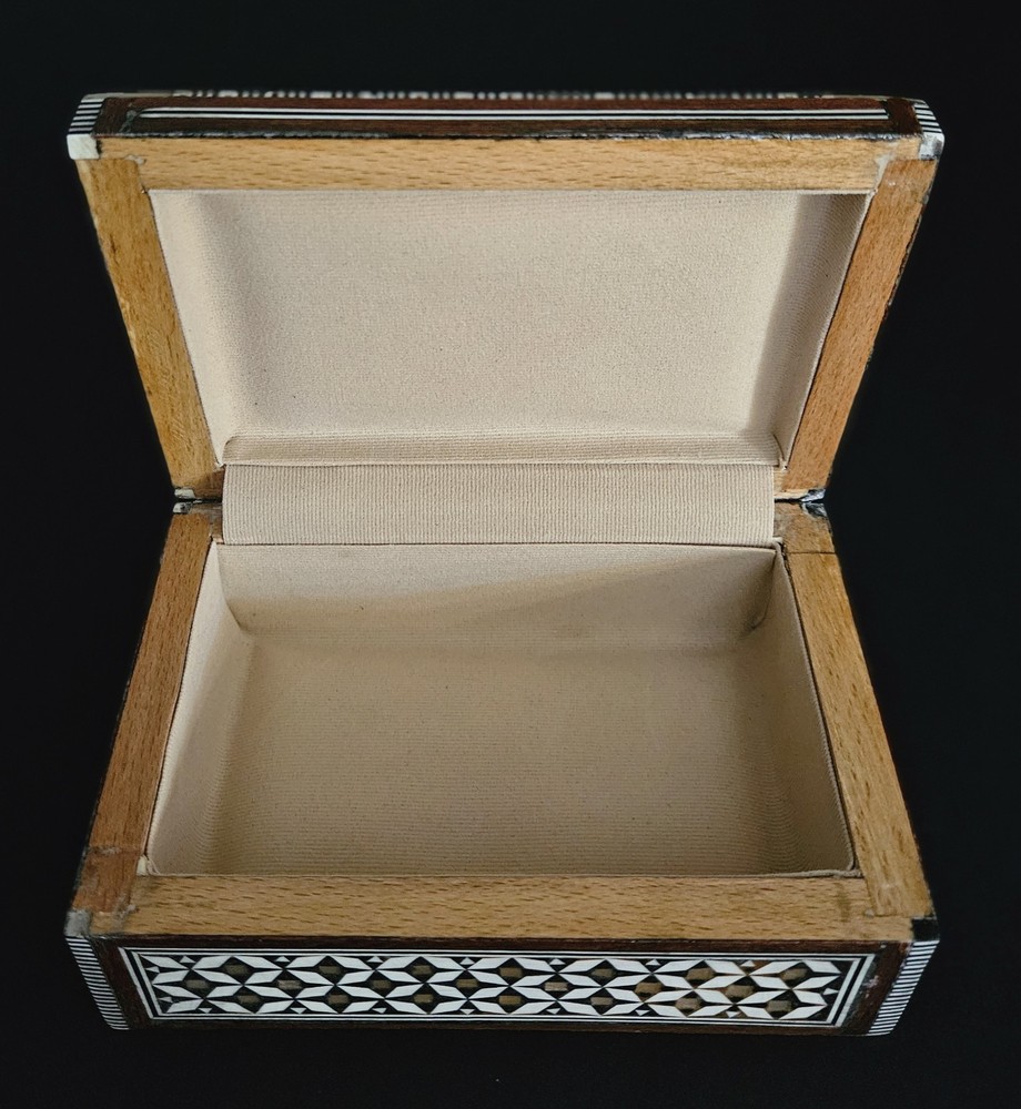 Vintage Egyptian mosaic inlaid mother of pearl & wood lined jewelry trinket box. 5.5"W x 2"H x 3 5/8"D. Excellent condition.