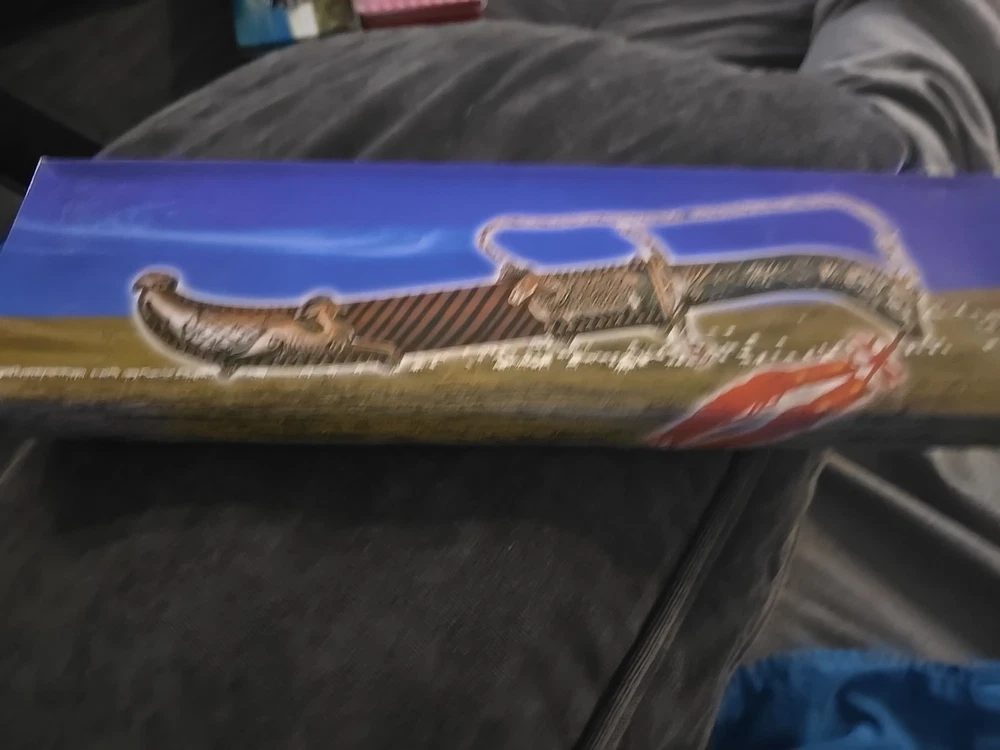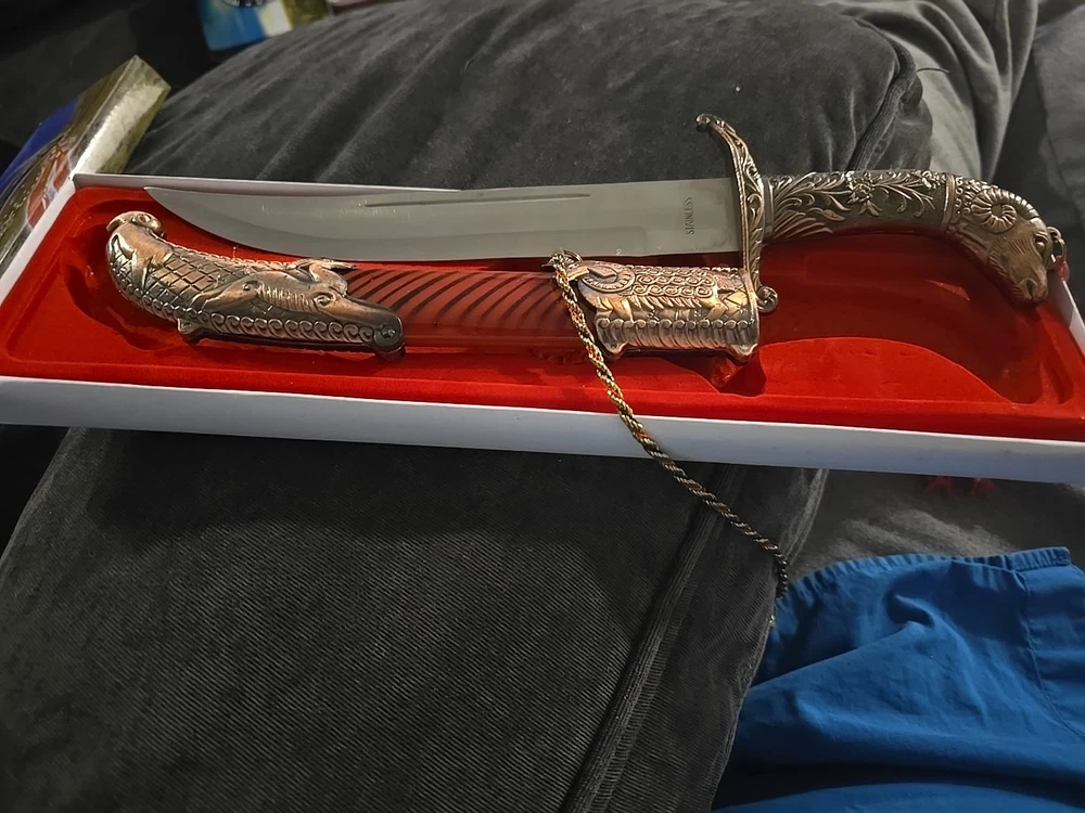 This is a knife featuring a stainless steel blade with a serrated edge and a silver color. It has a unique ram's head design on the handle, which is made of metal.