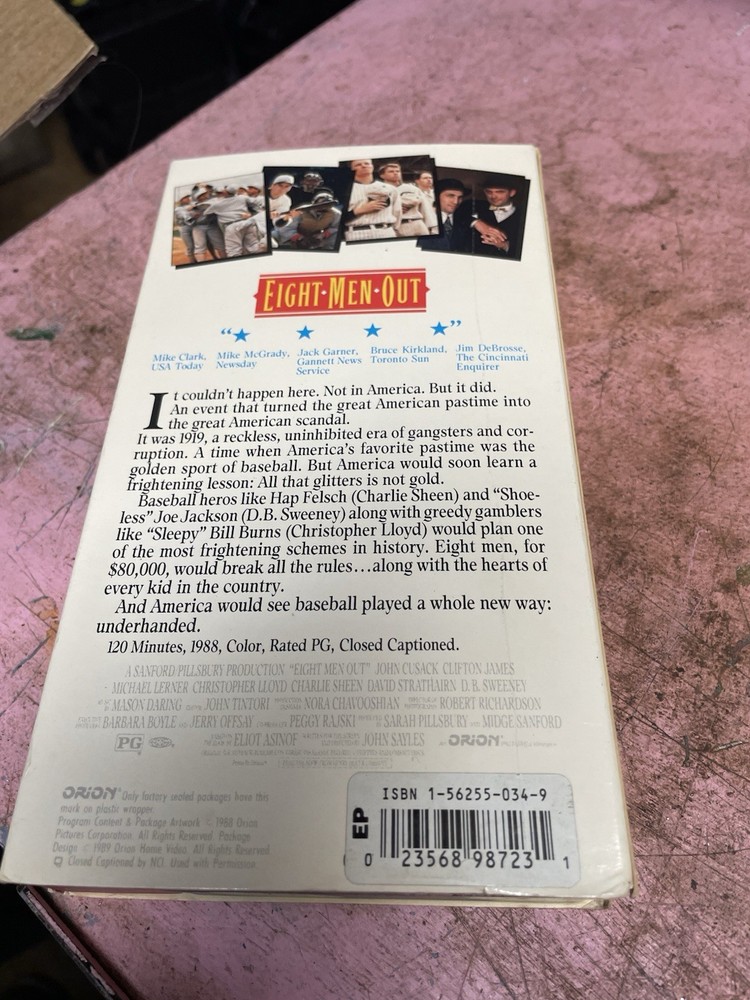 The "Eight Men Out" VHS Tape Bin 25 features the English language film directed by John Sayles and starring Charlie Sheen. This drama movie follows the story of eight Little League players from a town in California and their journey to competing in the 1950 championship. The VHS tape is in NTSC signal standard and has a G rating, making it suitable for family viewing. Perfect for fans of baseball and classic 1950s films, this VHS tape offers a nostalgic viewing experience of a heartwarming and inspirational story. Bin 25