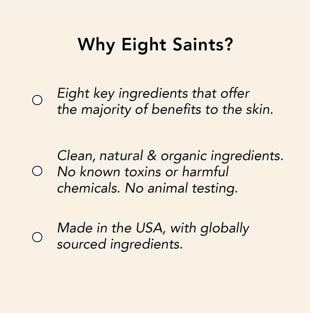 Eight Saints Retinol Eye Cream, Natural & Organic, For Smoothing Fine Lines and Wrinkles and Improve Skin Tone, 0.5 Ounces Product Details Brand: Eight Saints Item Volume: 0.5 Fluid Ounces Age Range (Description): Adult Active Ingredients: Hyaluronic Acid, hyaluronic_acid, vitamin_e Skin Type: All Package Dimensions : 3.66 x 2.36 x 1.97 inches; 0.5 ounces UPC : Manufacturer : Eight Saints Best Sellers Rank: #7,614 in Beauty & Personal Care (See Top 100 in Beauty & Personal Care) #54 in Eye Treatment Creams #54 in Eye Treatment Creams Customer Reviews: 4.8 4.8 out of 5 stars 681 ratings Retinol penetrates deep under the skin to stimulate collagen production to smooth out crows feet and fine lines. This eye cream speeds up cell turnover to fade dark circles and improves skin elasticity for a tighter, more youthful appearance. Hyaluronic acid rehydrates tired eyes, while green tea soothes irritation for a calm, revitalized look. For all skin types. A lightweight eye cream absorbs quickly and can be layered with serums and moisturizers for additional anti aging benefits. Unscented and fragrance free for maximum retinol efficacy. Key natural & organic ingredients include retinol, hyaluronic acid, Vitamin B5 and green tea. Cruelty free. Fragrance free. Made in Maine, USA with love from globally sourced ingredients. We're all about providing truth and clarity in natural, effective skincare. In a crowded market with over-hyped miracle ingredients, we found most ingredients don't produce results. We drilled down to 8 key ingredients that generated the majority of the benefits for your skin: Our "Eight Saints". Worry Free Return Policy: Try Eight Saints anti aging retinol eye cream worry free with our 30 day return policy. If a product doesn't work for you, contact us and we'll happily refund you!