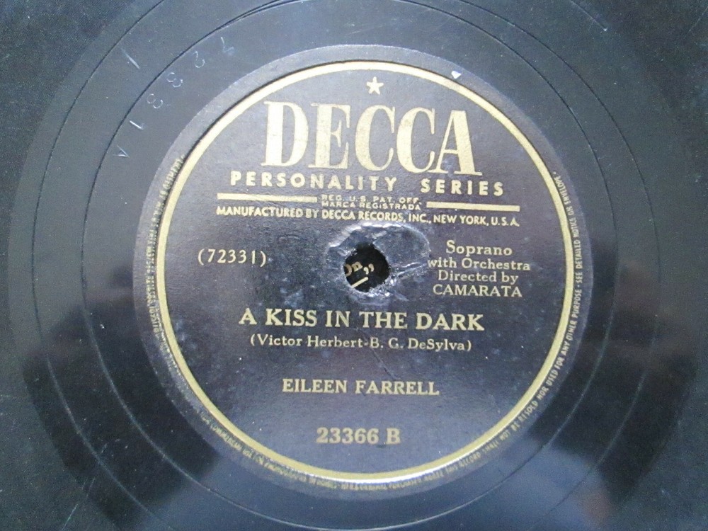 Eileen Farrell Always/A Kiss In The Dark Decca record 78 rpm Note: has scuffing, may tic PLEASE NOTE THE FOLLOWING: PLEASE PHOTOS FOR CONDITION OF LABELS Condition: all records that I have listed will be from local estates and are used. They are not in mint condition. I have not played or tested any records unless stated above. Each may have scuffing , scratches , dust, fingerprints, wear, fading, tears, writing on label and/or sleeve and other issues . May not have an inner sleeve. Covers may have scuffing, fading, tears, stains and other issues. _________________________________________________________ Please note that I am not a professional grader. I can only provide information about the items' conditions and not about a certain level of grading.