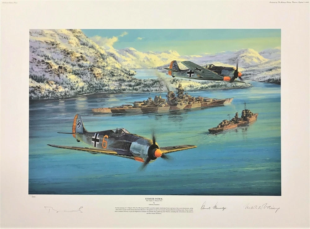 The Tirpitz 11 March 1943 EISMEER PATROL by Anthony Saunders On the morning of 11 March 1943, Fw190s from IV./JG5 left their base to escort the mighty battleship Tirpitz and a screening fleet of escort destroyers and torpedo boats, at the start of a voyage north to Bogen Bay during ‘Operation Rostock’, designed to escape the increasingly frequent British bombing raids. Tirpitz would leave southern Norway to join an impressive German naval battle fleet gathering near Narvik, one of the largest German naval bases in Norway. Together with the Scharnhorst , the heavy cruiser Lützow and the light cruiser Nürnberg , they would pose a grave threat to the Arctic convoys. Tirpitz was the flagship of the German Kriegsmarine. After repeated attempts to sink her she was eventually destroyed by Lancaster Bombers of 617 and 9 Squadrons at her anchorage in Altafjord on 12 November 1944. THE SIGNATURES This stunning print has been hand numbered and signed by artist as well as one of the few survivors rescued from the upturned hull of the Tirpitz when she was sunk, along with an escort pilot who was one the last to fly over the sinking vessel: Leutnant Zur See WILLIBALD VÖLSING He was Senior Controller in the Gunnery Fire Control Section on Tirpitz, one of the most important gunnery positions on the ship, passing vital information between the ship’s guns and the ship’s commanders. After the Tirpitz capsized, he was one of the few fortunate survivors to be released from deep inside the ship by rescuers cutting into the upturned hull. Oberleutnant KURT SCHULZE After serving during the “Blitzkrieg” in France, he then flew as a Me-110 wireless operator over southern Russia, and then night missions against England in Do-217s with I./KG2. In September 1943 he trained as a fighter pilot and flew 65 missions in Me109s with III./JG5 on the Arctic Front, scoring three victories. In November 1944 he flew in the ill-fated defense of the German battleship Tirpitz arriving too late to intercept RAF bombers. He finished the war in command of 16./JG5 in Norway. This is a striking print that carries outstanding signatures making it a really historic piece and a great buy at the original release price. Please note: The prints in my store are hand-signed by the veterans involved in the painting so the signatures are original autographs and not reproductions. The certificate of authenticity is included. CONDITION: My items are guaranteed to be in perfect condition, any issues are clearly detailed in the description. SHIPPING: As a long time aviation art retailer I have shipped countless prints over the years. My prints are rolled in acid free tissue and shipped in heavy duty tubes, and the shipping is insured and guaranteed. If you are interested in more than one item I will always do my best to combine the shipping to save costs – please just ask.