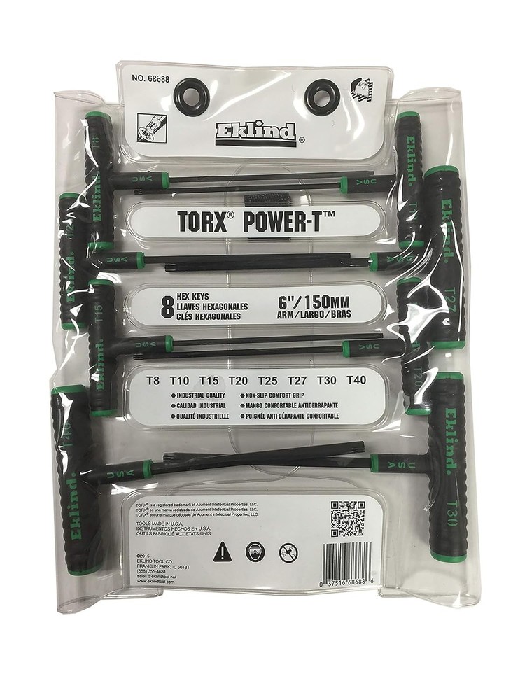 Eklind Tool 68688 Power-T Handle TORX Star Key Set, T8-T40, 8 Pieces Multi Product Details Is Discontinued By Manufacturer : No Product Dimensions : 1 x 1 x 1 inches; 0.16 ounces Item model number : 68688 Department : Unisex-Adult Manufacturer : Eklind Country of Origin : USA Color: Multi Brand: Eklind Tool Material: Blend Item Length: 6 Inches Item Weight: 4.54 g MADE IN AMERICA- High quality, Industrial Grade Professional Tools made in the U.S.A Contains TORX Sizes: T8, T10, T15, T20, T25, T27, T30, & T40 OPTIMUM STRENGTH- These EKLIND tools are made with EKLIND Alloy Steel that is heat treated, quenched and tempered for optimum strength, torque and ductility for safety and coated with a rust resistant finish TORX KEYS- Drive Torx, Torx Plus and star socket recess fasteners and meet all applicable standards set by the registered trademark holder, Acument Intellectual Properties, LLC EKLIND T-HANDLE HEX KEY- You get extra reach and extra leverage with the keys' longer shafts EKLIND POWER-T HEX KEYS- T-Handle hex keys have longer shafts to provide extra reach and leverage, feature a soft, textured cushion grip for extra comfort, slip resistance and safety and have the size permanently molded in the handle so you can identify with ease IDENTIFY YOUR TOOLS- Torx sizes are color coded in green so you can reach for the correct tool quickly MEETS OR EXCEEDS ALL APPLICABLE STANDARDS- EKLIND tools meet or go beyond the standard regulations set forth in ANSI, ASME, RoHS, REACH, CA Prop 65 and Dodd-Frank Conflict Minerals Legislation EKLIND TOOL COMPANY is America's leading manufacturer of high quality, industrial grade hex keys, made with pride in the U.S.A. since 1950. The EKLIND 68688 Power-T Handle TORX star Key - 8pc set T8-T40 (6In shaft) meets the most stringent requirements of professional mechanics, tradespeople, do-it-yourselfers and hobbyists.