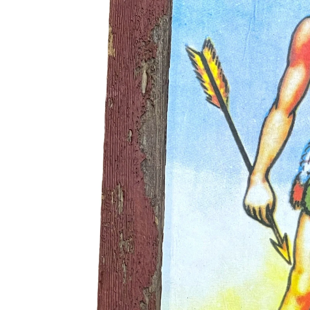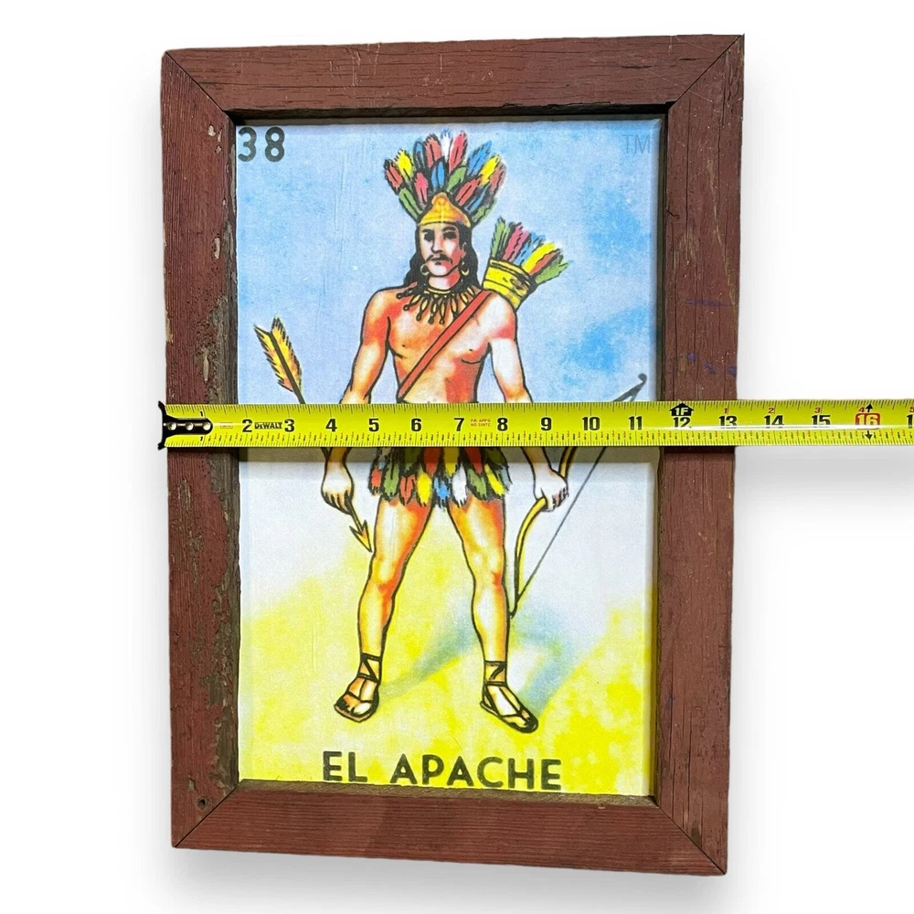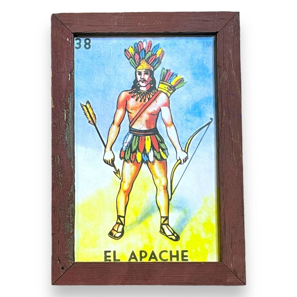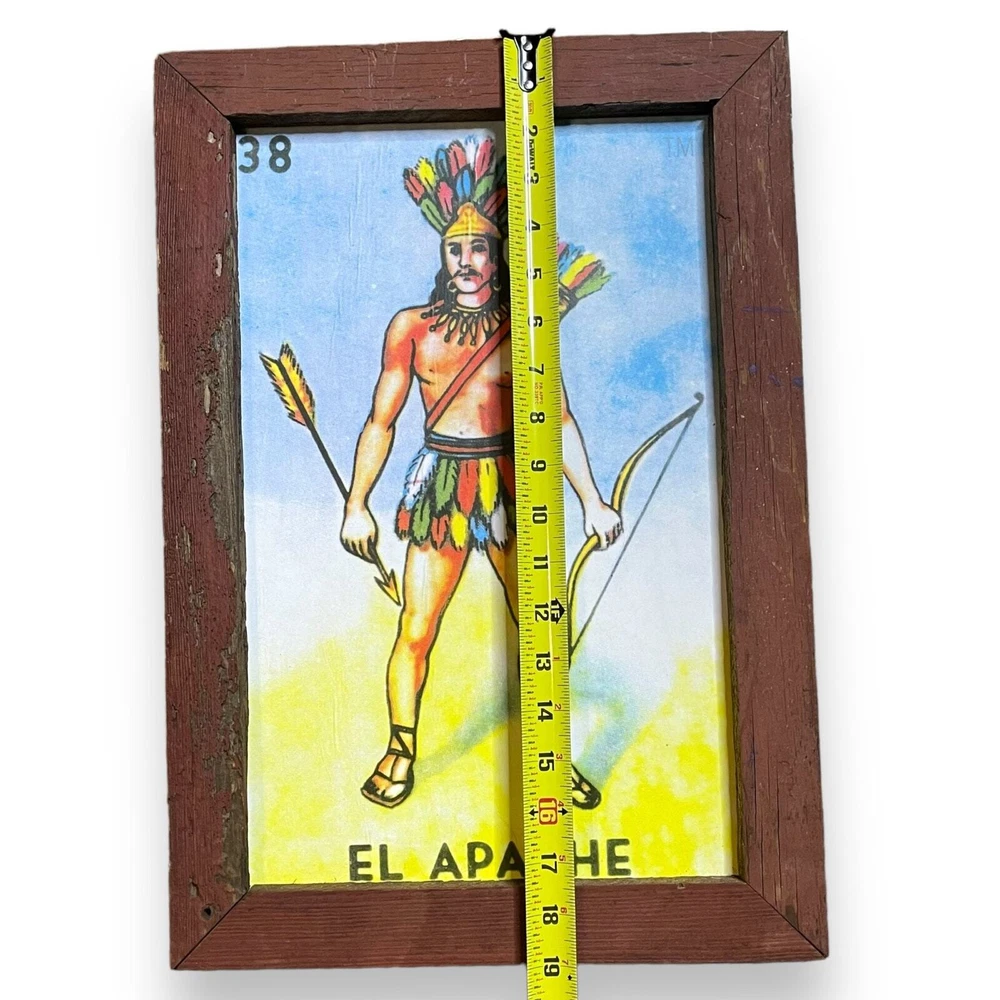 El Apache Loteria Framed Print Rustic Distressed Wood Mexicana Design "Transform your space with the rustic charm and vibrant design of El Apache Loteria Framed Print. Crafted from high-quality wood, this Mexican-inspired artwork is a striking addition to any room. Captivate your guests with its unique character and bright colors. Perfect for anyone who loves bold, eccentric décor. The print is in good used condition and ready to hang. There is some wear on the frame and some paint stains. The print is also buckled in a few places.