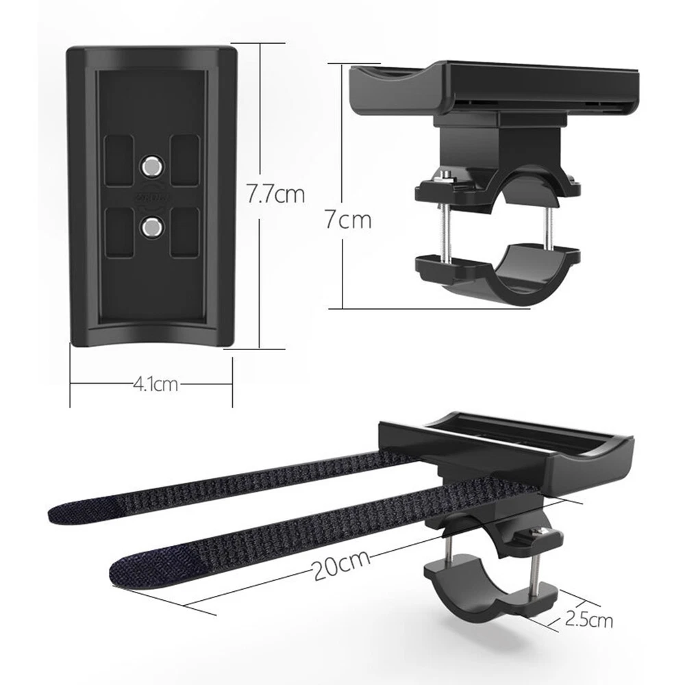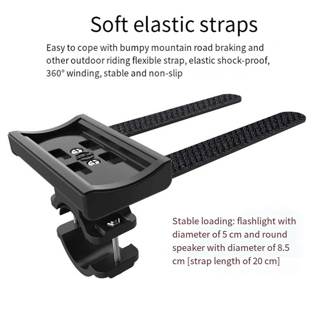 Bicycle Light Bracket Bike LED Flashlight Speaker Mount Holder with Elastic6187 and high quality Made of high quality material, and practical to use Elastic shock-proof strap design, easy to carry various body equipment, pull and press, you can fix it Simple installation of riding equipment, no special tools are required for installation and use, and the installation position can be according to the actual situation Two-point fixation, make the equipment flat and horizontal, fit closely to the bracket platform, no hard and no damage to the machine, easy to deal with various outdoor riding such as bumpy mountain roads and sudden Thickened rubber pad protection design, shockproof, non-slip, scratch-, soft rubber, soft fit, stable and not shaking Fixed screw installation, adjustable size, steel metal material, long-term use without rust, thickened ABS composite material, high hardness and high toughness, double durability According to different installation requirements, the platform can be installed horizontally or vertically, the rotation is locked with screws, and the screws can be removed when adjusting. Embedded connection design, the installation position does not need to be debugged Weight:About 60g Colour:Black Material:ABS Size:About 77x70mm Package Contents: 1 x Bicycle Light Holder