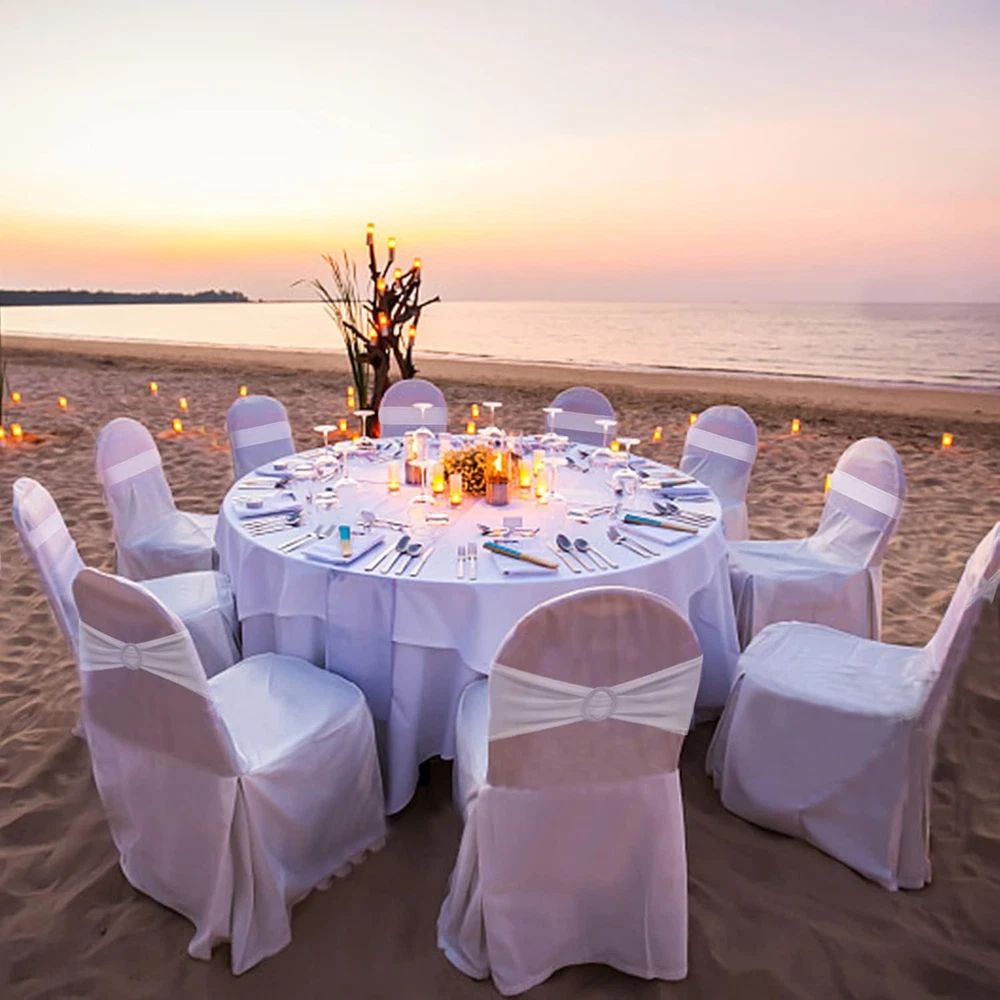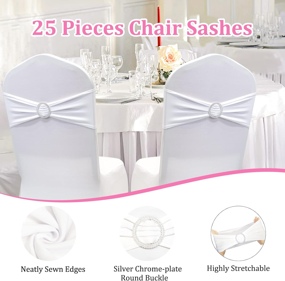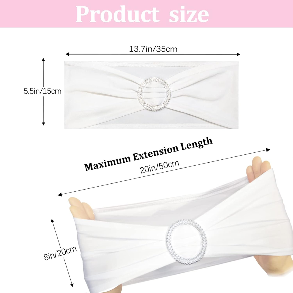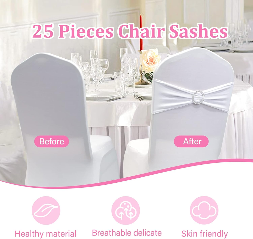 Add a touch of elegance to your event decor with the Zhongyuan Spandex Chair Sashes. Designed for versatility, these white chair covers are ideal for weddings, parties, or any special event. The rectangular shape and solid pattern seamlessly blend with various table settings and centerpieces. Each sash measures 14"W x 6"H, ensuring a perfect fit for most chair backs. Crafted from a blend of 90% polyester and 10% spandex, these chair bows are both durable and elastic, offering a snug, stretchable fit without the need for assembly. The included fabric and buckle components allow for easy decoration, while the machine-washable design ensures hassle-free upkeep. The set contains 25 pieces, allowing for a cohesive look throughout your venue.
