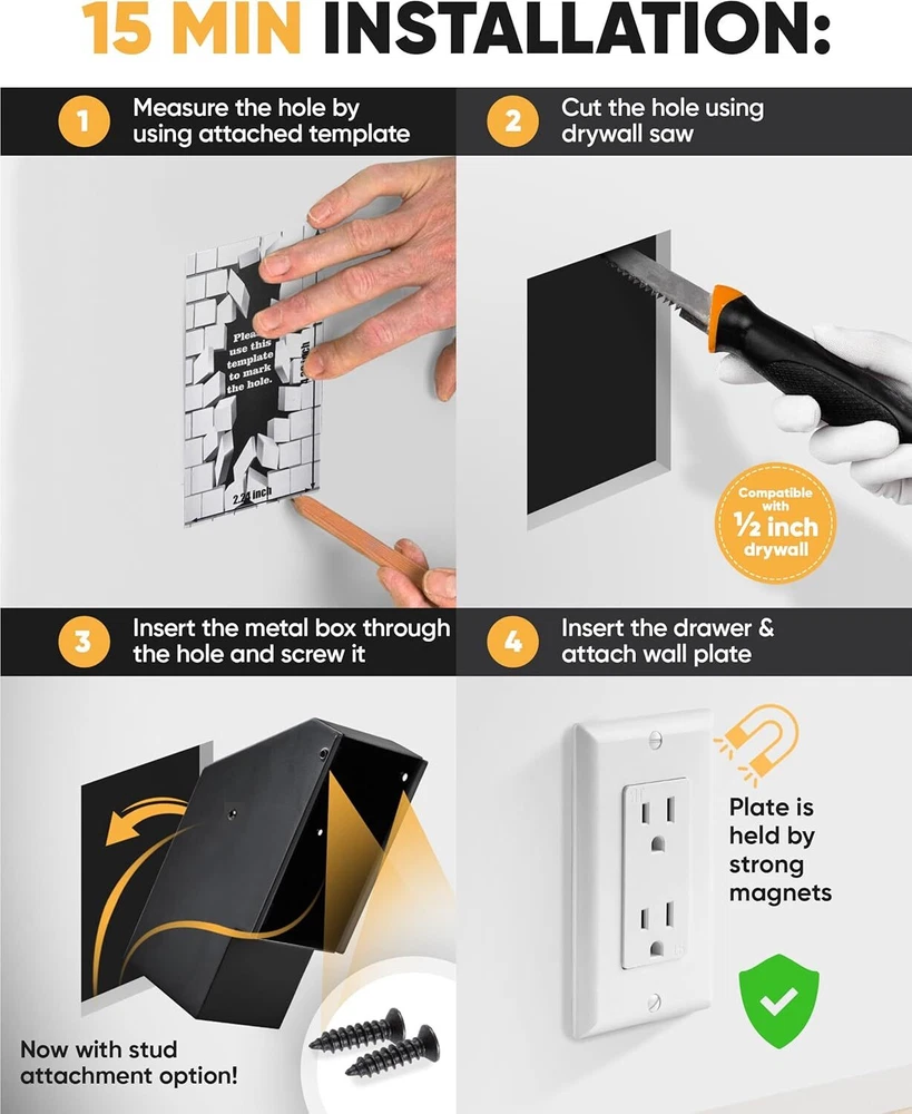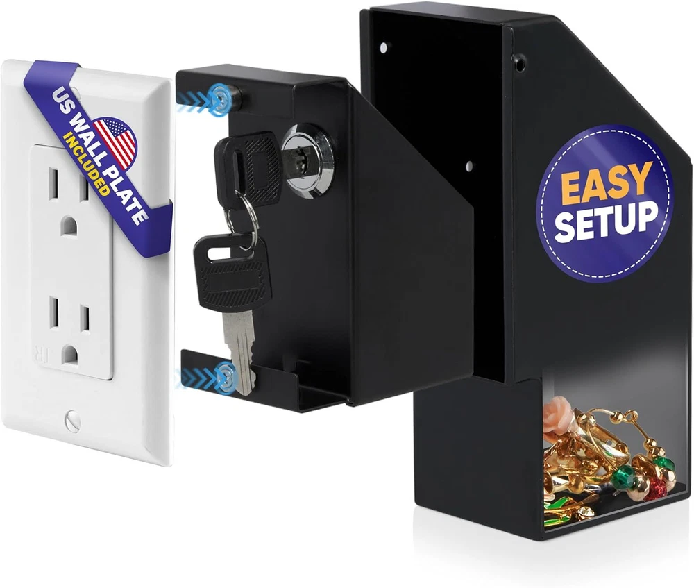 Elder Welder® Wall Outlet Hidden Safe with Key Lock 1-Gang Plate, White Product Details Brand: Elder Welder Product Dimensions: 2.2"D x 6.15"W x 3.15"H Lock Type: Key Color: White Capacity: 30 Cubic Inches Material: Alloy Steel Special Feature: Removable Shelf Mounting Type: Wall Mount Control Type: Key Control Included Components: Screws for Drywall and/or Stud Attachment, External Metal Box + Drawer + Wall Plate, 2 Keys, Mounting Template, Written & Video Install Guide Screws for Drywall and/or Stud Attachment, External Metal Box + Drawer + Wall Plate, 2 Keys, Mounting Template, Written & Video Install GuideScrews for Drywall and/or Stud Attachment, External Metal Box + Drawer + Wall Plate, 2 Keys, Mounting Template, Written & Video Install Guide See more EASY ACCESS & INSTALLATION - with a written and video manual included, installation of this in-wall safe is a breeze and can be completed in under 30 minutes. Once installed, you have easy access to your secret safe within a few seconds! SAFER THAN EVER - unlike book safes or furniture secret compartments, this hidden safe offers you a robust metal container with a 100% real wall plate for added security. Need more protection? Just plug a fake cord into the outlet! SMALL BUT PRACTICAL - this hidden compartment offers a capacity of 30 cubic inches, with the option to choose between two smaller compartments or one larger secret compartment. Keep your valuables protected with this hidden storage solution! DISCREET PACKAGING - we value your privacy, and we really mean it, which is why this diversion safe comes in a discreet packaging. You can be sure that no one but you will find out about your hidden wall safe. DID YOU KNOW - on average a thief spends 9 minutes on a house burglary, which is enough time to check obvious hiding spots like bedside table or furniture safe. That's why you'd better have a diversion safe that won't be detected!