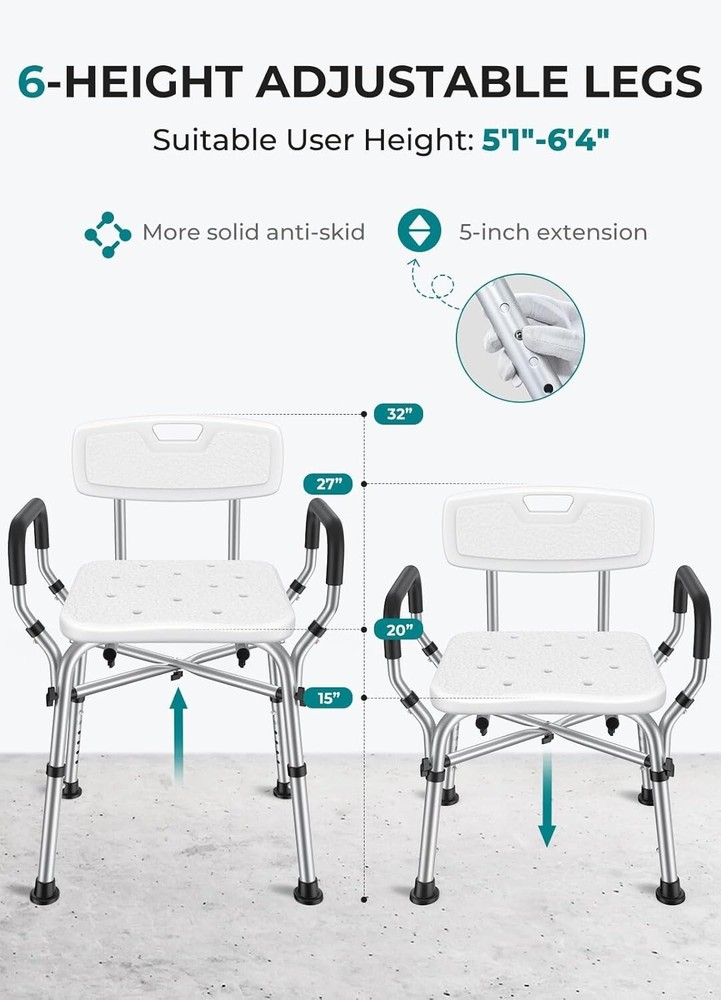 About this item Sturdy Shower Chair With Arms and Back in Anti-corrosion Aluminum Construction HEAVY DUTY SHOWER CHAIR: Made of high-quality aluminum with reinforced frame, the handicap shower chair with crossbar supports up to 550 lbs, sturdy but light to move easily, enhanced stability & balance to add extra support for large adults, elderly and disabled SAFETY MEETS COMFORT: The shower seat comes with soft EVA padded armrests and backrest for long-lasting seating comfort, thanks to anti-slip rubber feet, the bath chair is safe and easy to sit down & stand up, non-slip while bathing in a wet shower or bathtub. Rust-resistant & waterproof material of bathroom chair ensures quick-drying for long-lasting durability TOOL-FREE ASSEMBLY IN 10-MIN: The instructions for shower chairs are straightforward! Tool-free assembly with clear directions and labeled parts of tub seats for seniors, as well as a detailed video installation guide, in just 10 mins 6-HEIGHT BATH SEAT: Easily adjustable to six heights (27.5" to 32.5"), the bariatric shower chair with arms and back fits users from 5'3" to 6'5", offering more comfort and support than a shower stool/shower bench, meeting the needs of all age groups CONVENIENT & VERSATILE USE: The shower chair for inside tub includes a showerhead holder and shower bag to free your hands. 4-in-1 mode (shower stool/shower chair with arms/shower chair with back/shower chair with arms and back) can be adjusted as needed, an ideal shower chair for elderly and disabled, pregnant, and recovering from surgery