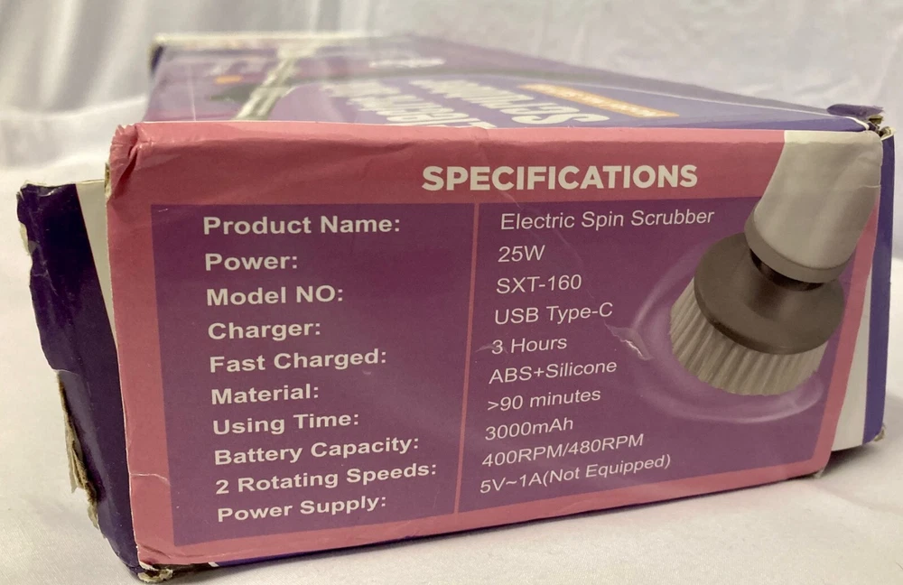 Tracking Number is provided for all listings! -- All items will be shipped out within 0-1 days after purchase! Feel free to ask us any questions you may have for our listings! -- Electric Spin Scrubber, Shower Cleaning Brush, 2 Adjustable Speeds Cordless Power Spinning Cleaner Brush with 7 Replaceable Brush Heads for Tile, Tub, Sink, Wall, Bathroom SXT-160 25watts USB TYPE C CHARGES IN 3 HOURS 90 Minute use time 3000mah 2 rotating speeds - 400rpm/480rpm