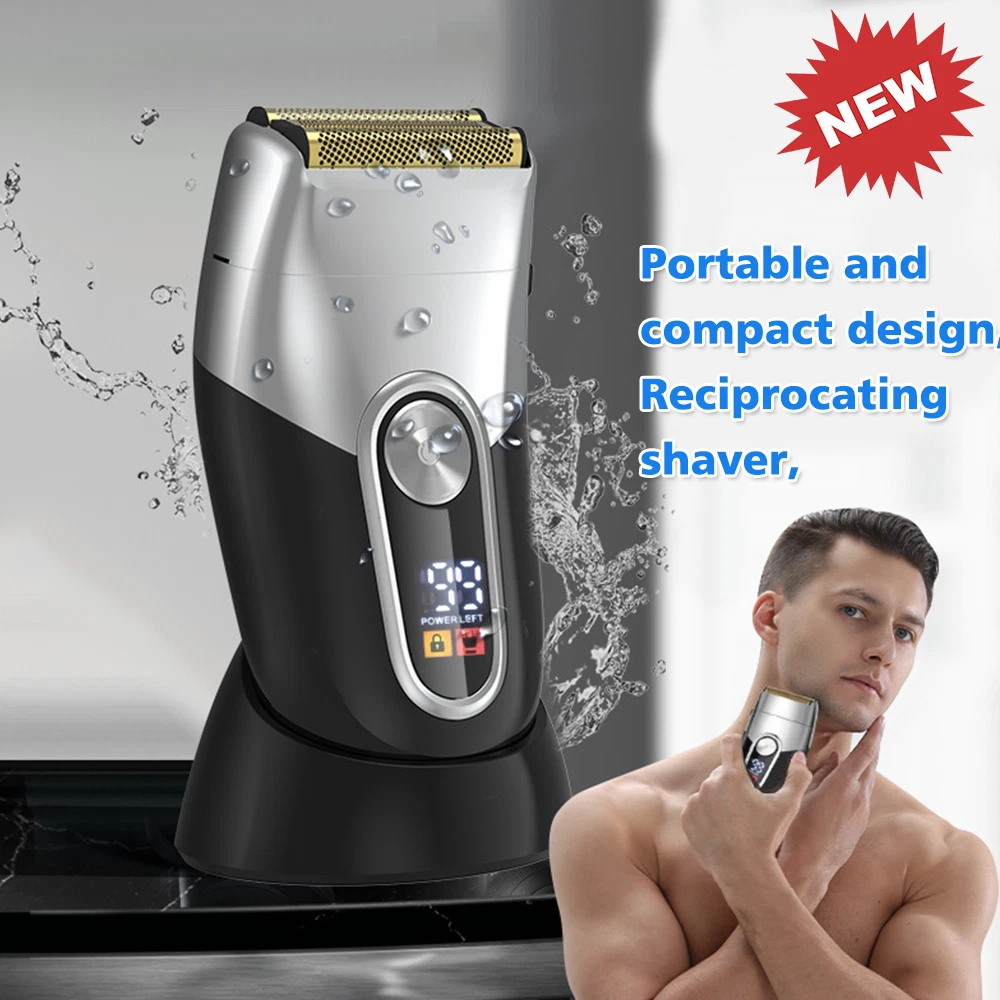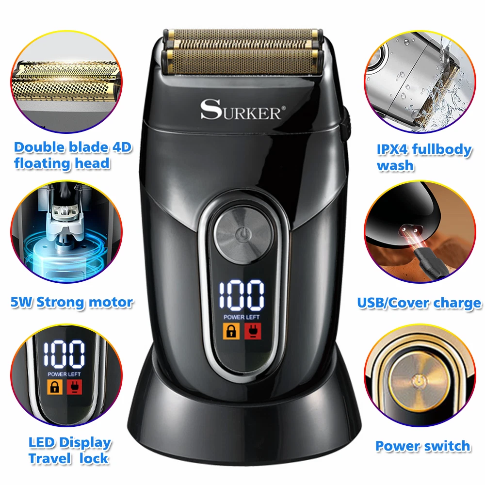 Specifications: Best for hair, beard, stubble, shaved head bump free shaving and super close shaving clean up hair and neck lines for smooth finish cord/cordless shaver shaper a great tool for an extra-close shave on the neck,face and all around the hairline 100-240V voltage,50/60Hz Cord/cordless work powerful and quiet rotary motor gold titanium hypoallergenic foil for irritation-free shaving 2 blade cutting shaving system 600mAh Lithium-ion battery LCD display, charging reminder, battery power percentage reminder contains travel lock function, press and hold the switch for 3 seconds, the machine will be locked, if unlocked, do the same operation USB Line charger model Package Included: 1* T rimmer 1* Protective cover 1* C harger 1* Cleaning brush 1* Manual INSTRUCTIONS FOR USE : 1. Men whose skin is sensitive or easily irritated by shaving, or who suffer from a skin allergy, should test one section on the leg or arm before using the shaver. 2. Remove the protective cover and turn on the unit to start shaving. Hold the shaver at a right angle to the area of your face that you want to shave and run the single shaving foil carefully along your skin. Tip: In general, we recommend that you shave against the direction of hair growth, as this is the best way to trim the hair. Pull your skin tight, with your fingers in inaccessible areas, to achieve optimum results. 3. Do not push the shaver on the skin too hard as it could cause irritation, make the shaver warm and prevent a perfect shave. 4. Please note that it takes 2 to 4 weeks for your skin to adapt to a shaver, so please do not change shaving instruments in this period of time. 5. If hair is longer than 1/32” begin by cutting the hair down first with a trimmer, then use shaver for a smooth close finish.