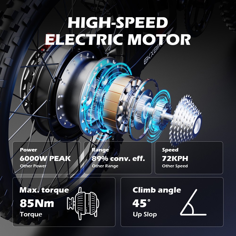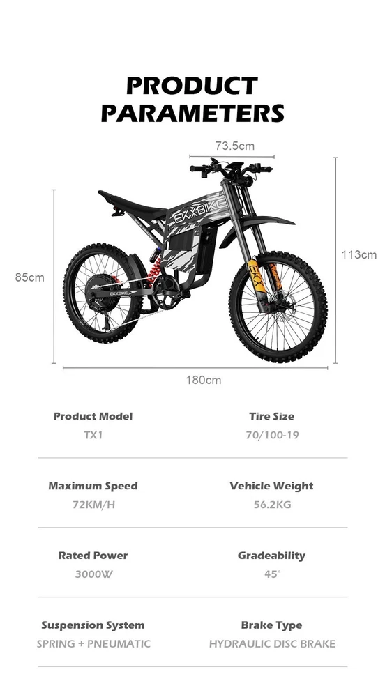 🚴 Peak 6000W Motor & 45MPH Top Speed : This fast electric bike is equipped with a 3000W brushless permanent magnet motor (6000W peak power) that delivers non-stop strong torque—easily tackling slopes up to 40° with stable climbing performance. Its max speed hits 45MPH to slash travel time, while the motor’s heat-dissipating alloy casing prevents overheating even during long hours of high-power use. 🚴 60V 30Ah Large-Capacity Battery & 3A Fast Charging : The 60V 30Ah high-density lithium-ion battery offers 45 miles of pure electric range.Paired with a 3A high-efficiency fast charger, it fully recharges in just 10-12 hours. Plus, the battery has built-in overcharge, over-discharge, and short-circuit protection to extend its service life, so you get reliable power for years. 🚴 NFC/Password Unlock & Large Color LCD Display : Ditch bulky keys! Unlock your e-bike in 1 second via an NFC card or 4-digit password—perfect for busy mornings or sharing the bike with family (no more fumbling with extra keys). The bright 4-inch color LCD display shows speed, battery level, riding mode, mileage, and time at a glance—clear even in direct sunlight. No more guessing battery life; stay informed to plan every ride with confidence. 🚴 Hydraulic Disc Brakes & Versatile Riding Fun : Safety meets flexibility! Hydraulic disc brakes provide 30% shorter braking distance than mechanical brakes, plus stable stopping force—even at 45MPH, you can slow down or stop safely. It also comes with a professional 7-level shifting system: low gears boost climbing power, while high gears enhance speed on flat roads, adapting seamlessly to complex road conditions. 🚴 Full Suspension & 70/100-19 Off-Road Tire : The features 70/100-19 off-road tires, known for their large-tooth tread design that provides excellent grip and stability in complex terrain. These all-season tires offer superior off-road and anti-skid performance, making them ideal for diverse climatic conditions and ensuring safety on slippery or muddy roads. These all-season tires offer superior off-road and anti-skid performance, making them ideal for diverse climatic conditions and ensuring safety on slippery or muddy roads. 🚴 Please be advised: The electric dirt bike accommodates riders ranging from 5 feet 6 inches to 6 feet 4 inches tall (167-193cm), featuring a seat elevation of 83cm (32.67 inches) from the surface. Should you have any inquiries or concerns, please feel free to reach out to us promptly through eBay Messages for a swift response! 🚴Features & Accessories: Adult e-bikes are 85% pre-assembled, reducing the need for complex assembly. It is certified to UL 2849 Label On Frame And Battery.Safety-backed by UL2849 & GCC certifications. Enjoy 1-year warranty, 24/7 support. If you encounter any problems please contact us and we will solve the problem for you. Please keep the original packaging for 30 days after you receive your bike. Basic Feature : Expanded size: 174cm*97cm*65cm(68.5"*38.2"*25.6") Actual weight: About 60kg Frame material: Steel Front fork: Hydraulic Front fork Braking system: Front and rear hydraulic brakes Transmission system: Rear drive Tire size: 70/100-19 Off-road Tyres Applicable height: 160-195cm(63"-76.8") Display: LCD Maximum speed ≤ 70km/h (45MPH) Endurance 80-120km (50mile-75mile) Slope <35° Waterproof grade: IP67 Load weight ≤150kg(330LBS) Motor parameters: 60v 3000w Brushless Motor Charging Output power 3A Charging time 4-8H Battery type: 60V 30AH lithium battery Undervoltage protection: 60V Overcurrent protection: 80A Packing list: 1x Electric bicycle 1x Battery 1x Charger 2x Pedal Our products have been certified under UL2849 safety standards.