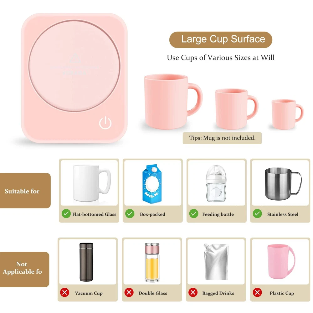 Adjustable Three-Temperature Setting: coffee warmer will keep your coffee at a perfect drinking temperature. You can control the temperature by tapping the button, keeping your coffee or milk up to 104℉-131℉-149℉ (40℃-55℃-65℃). Changing temperature is just a tap on of your finger. Automatic Shut-off & Smart Safety Feature: This smart cup warmer will shut off automatically after continually working 4 hours. No worry about forgetting to turn it off. The blinking red light indicator tells you the heating plate is hot and will stop until the temperature drops to 97℉ (36℃). Splash-proof & Large Heating Plate: The heating plate adopts sealed-insulation technology to prevent splashing water, which also fits most standard mugs well. The 59-inch plug cord will fits on your desk perfectly. Tips: Choose flat-bottom and thin-wall mug so that it can have a good connection to the warmer. Easy-to-Clean & Portable-to-Carry: The surface of the heating plate is easy to clean. The candle warmer is lightweight and will be a ideal choice for present on Birthday, Thanksgiving Day and Christmas and so on. Satisfactory Customer Service: Your satisfaction is our top priority. We will help you solve any problems in 24 hours. For more information on how to use the warmer, please scroll down to get a User Instruction.
