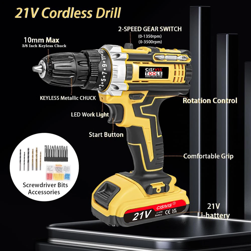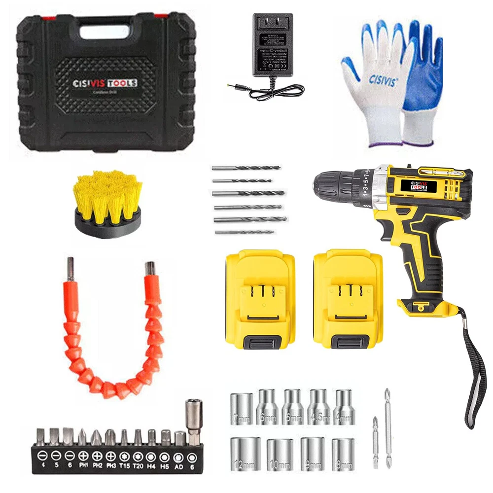 To Fit ::Drill wood, Steel, Cement / Electric screwdriverCharging Time:1h-2hPlug:US Pluggtin13:dose not applyType:Drill SetCable Length:CordlessEAN:dose not applySet Includes:Battery, Battery Charger, Drill Bits, Screwdriver BitsModel:Cordless DrillFeatures:LightweightBattery Technology:Lithium-Ion (Li-Ion)Motor Type:BrushedColor:YellowUPC:dose not applyMPN:dose not applyAuxiliary Handle:NoVoltage:21vNumber of Batteries:2PCS OR 1PCSCustom Bundle:NoBrand:UnbrandedMaximum Torque:33N.MPower Source:BatterySpeed:0-550/0-1850rpm