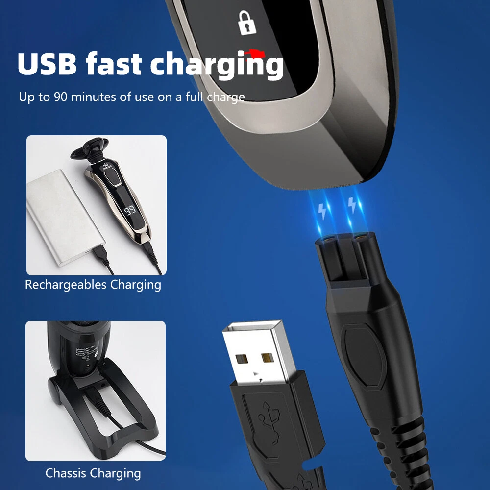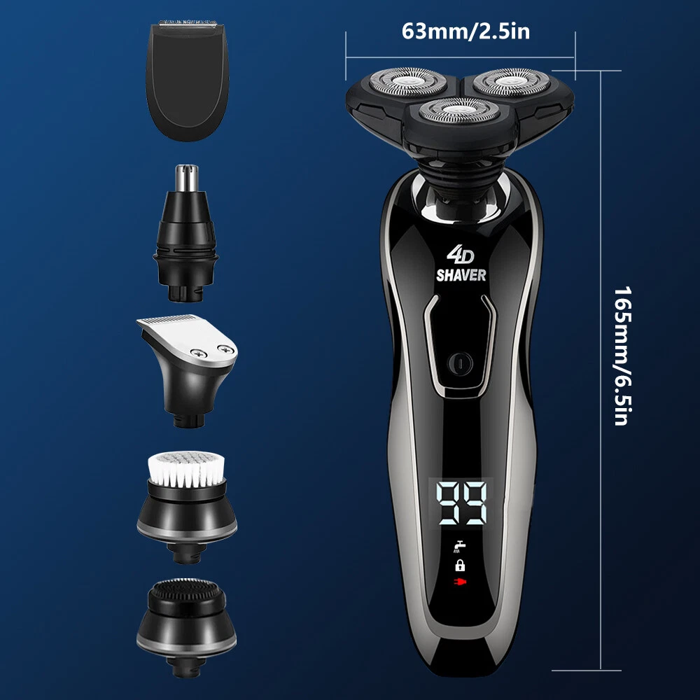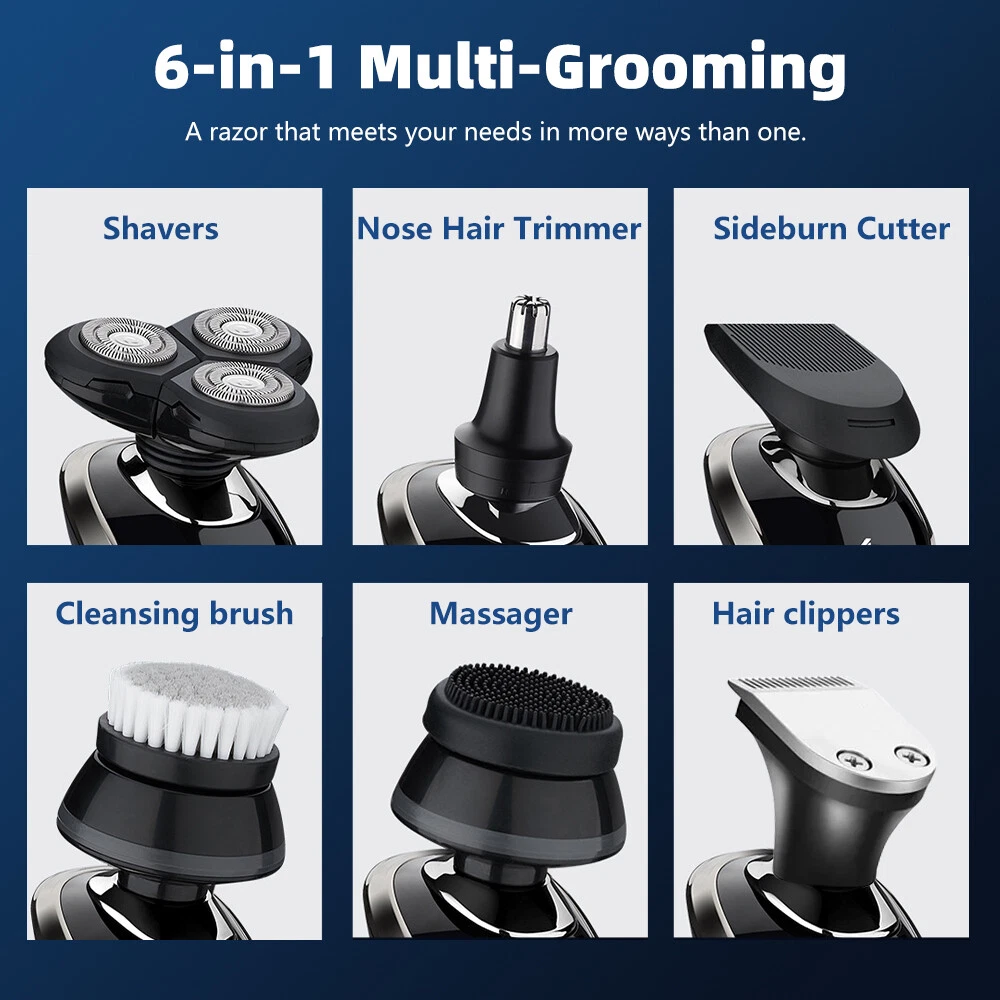 Fea t ures : -Low noise. -LCD display: shows the remaining time available -Suitable for dry and wet. -Ergonomic design makes it more com fortable. -Design of the independent charging stand makes it more high-end. -Removable razor head for easy cleaning and maintenance. -Precision trimmer for safe, gentle trimming and shaping. -Sideburns trimmer, clean your hair cleaner. -The whole body can be directly washed with tap water, which is safe and convenient. -Double ring independent floating blade. Intelligent floating system, 360 ° to match your face. -The hair shave has double ring swimming net, which closer to the hair root, can quickly remove hair, not hurt the skin. Spe cifica tions : Product Type: 6 in 1 Men Grooming Kit Color: Black Material: ABS+ Steel Input Voltage: DC5V Rated Voltage: 3.7V Rated Power: 5W Battery: 500mAh-800mAh Lithium Charging Time: 2 Hrs Work Time: 90Mins Waterproof Rate: IPX6 Cable Length: 80cm/31.5in Power supply type: USB rechargeable LED display: the remaining time Cleaning method: full body washable Head Type: 3 Head Rotary Motor Type: Rotary Size: 16.5 * 6.3 cm Package C ontents : 1 * Electric razor 1 * Hair trimmer head 1 * Precision Trimmer 3 * Limit Combs (3mm, 5mm, 7mm) 1 * Facial Cleansing Brush Head 1 * Soft Face Sponge 1 * Nose trimmer head 1 * Foldable Charging Stand 1 * USB Charging Cable 1 * Razor Cap 1 * User Manual
