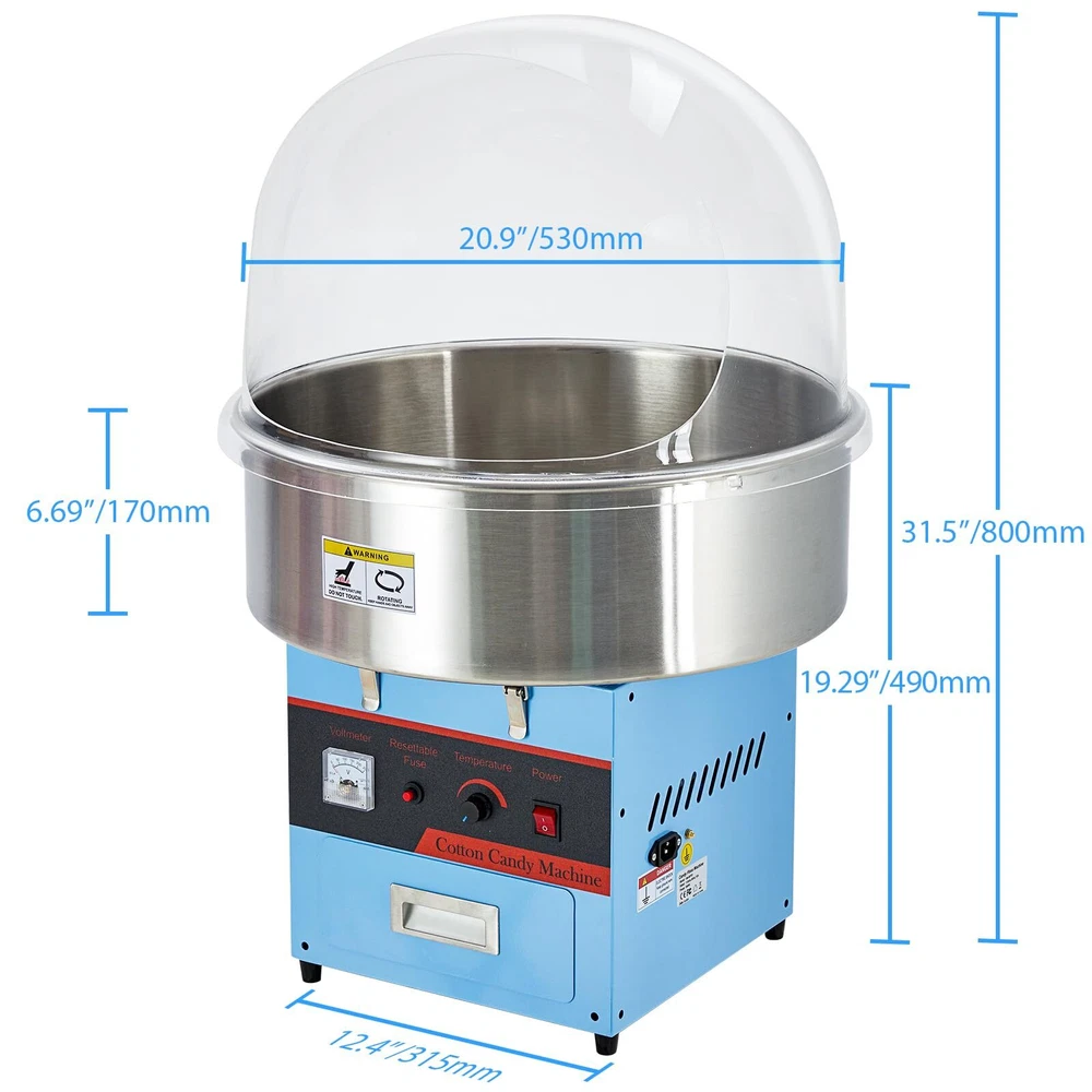 - **Powerful 980W Performance**: Experience superior cotton candy making with the Electric Cotton Candy Machine, boasting a robust 980 watts for quick and efficient production. Perfect for kids' parties and festive events. - **User-Friendly Temperature Control**: Easily adjust the temperature from 245°F to 439°F with a simple knob, ensuring optimal results with every batch. This cotton candy maker machine is designed for both beginners and pros alike. - **Convenient Built-In Storage**: Keep your essentials organized with the integrated steel supply drawer, perfect for storing cotton candy cones, sticks, and floss sugar packs. Everything you need is within arm's reach. - **Easy Cleanup**: The 21-inch stainless steel bowl is easily removable, making post-event cleanup a breeze. Spend more time enjoying and less time cleaning with this efficient candy cotton machine. - **Versatile Ingredient Options**: Whether using traditional flossing sugars or experimenting with milk sugars, fruit cubes, or hard candies, this cotton candy maker accommodates all, offering endless creative possibilities.