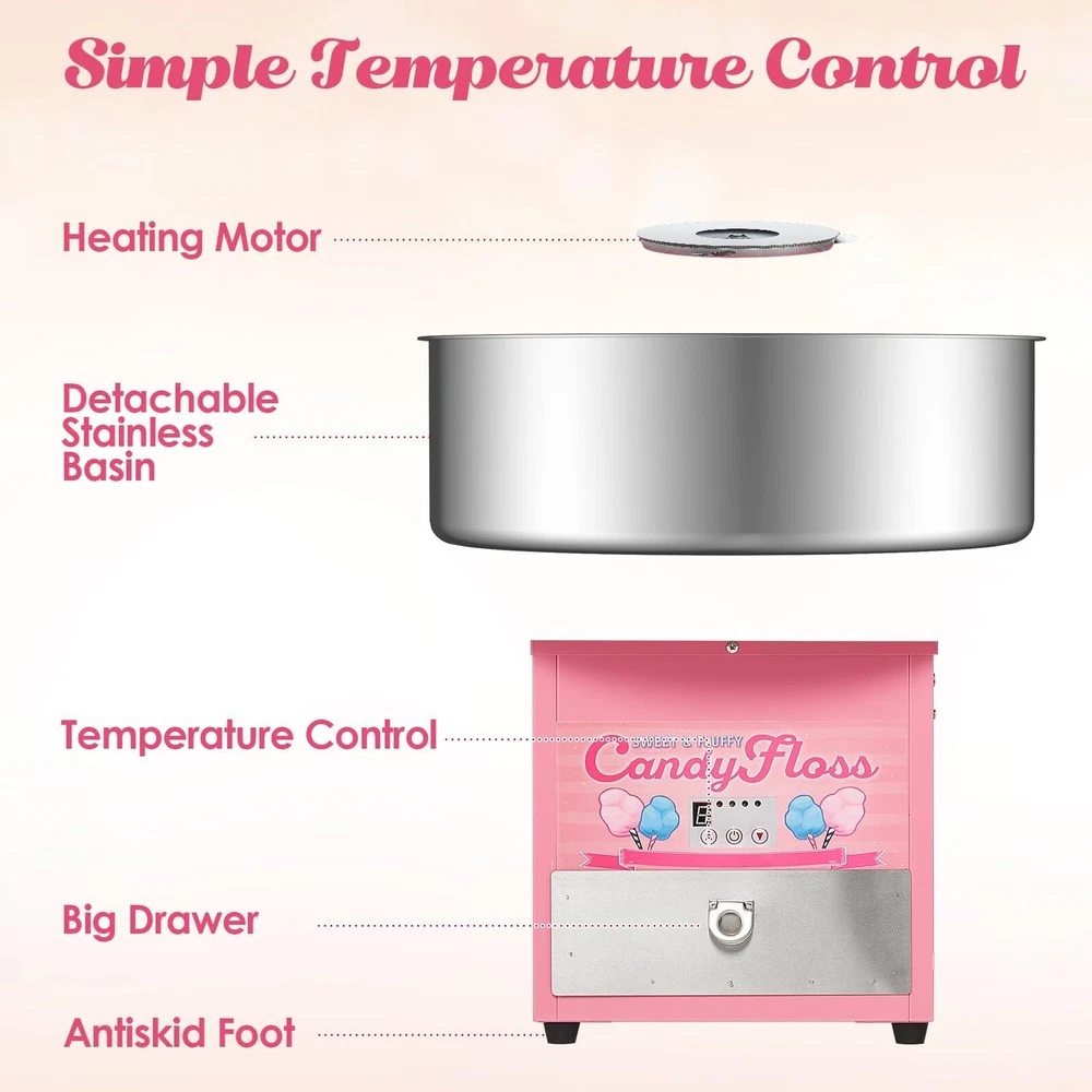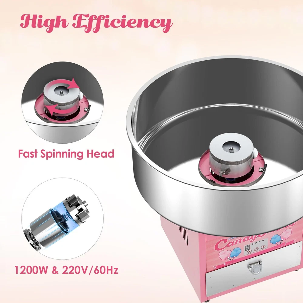 Electric Cotton Candy Maker Commercial, Cotton Candy Machine for Kids with 20 inch Stainless Steel Bowl for Family, Party, Amusement Park, Carnival- Pink 【High Efficiency】Our commercial cotton candy machine features a digital display screen.1200W, 120V, Aluminum sugar outlet for heating evenly. Producing up to 2-3 servings per minute, which makes your operation more efficiently. 【Safety Material Environmental 】Made of high quality stainless steel, the commercial cotton candy machine is durable and corrosion-proof, which also ensures food security and safeguard your health.The aluminum candy outlet ensures even heating and prevents overheating. The built-in large capacity drawer provides extra storage space for sticks or other tools. 【Temperature Adjustable with Super Space】Adjust the Temperature Control Button as needed, wait for it to warm up (about 5 mins), pour in the sugar and within minutes delicious cotton candies are done.Suitable for different kinds of candies. Large 20.5" food grade stainless steel bowl and Sugar Scoop. Unit disassembles for simple cleaning. 【Super Space】Large 20.5" food grade stainless steel bowl and Sugar Scoop. Unit disassembles for simple cleaning. 【Various Applications】The Cotton Candy Maker Machine is suitable for professional sellers and novices. And it is perfect for the family party ,carnivals, sporting events and street stalls.