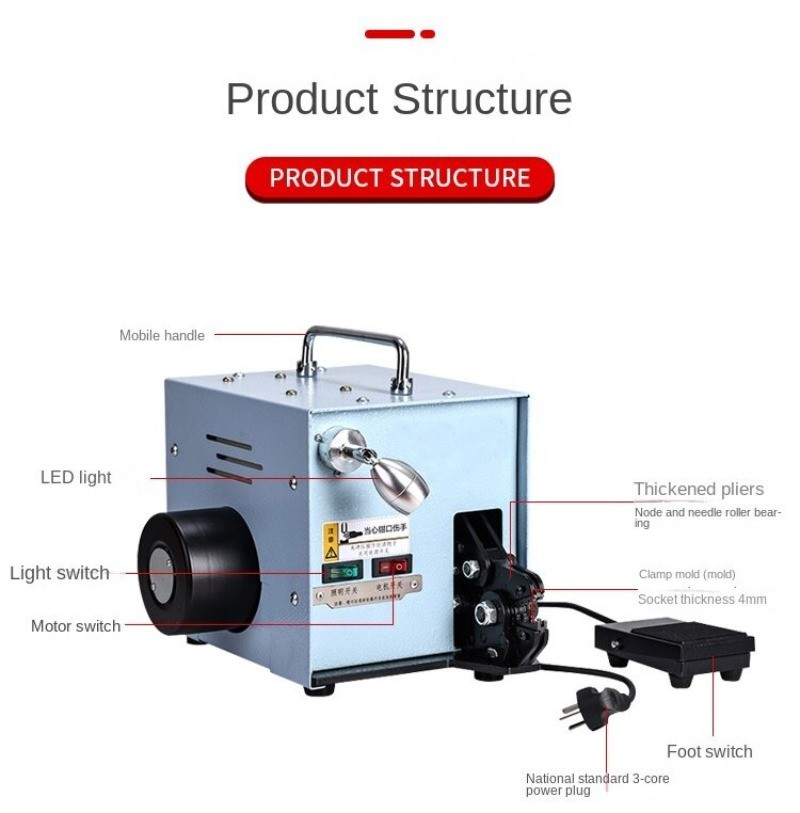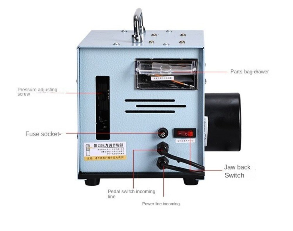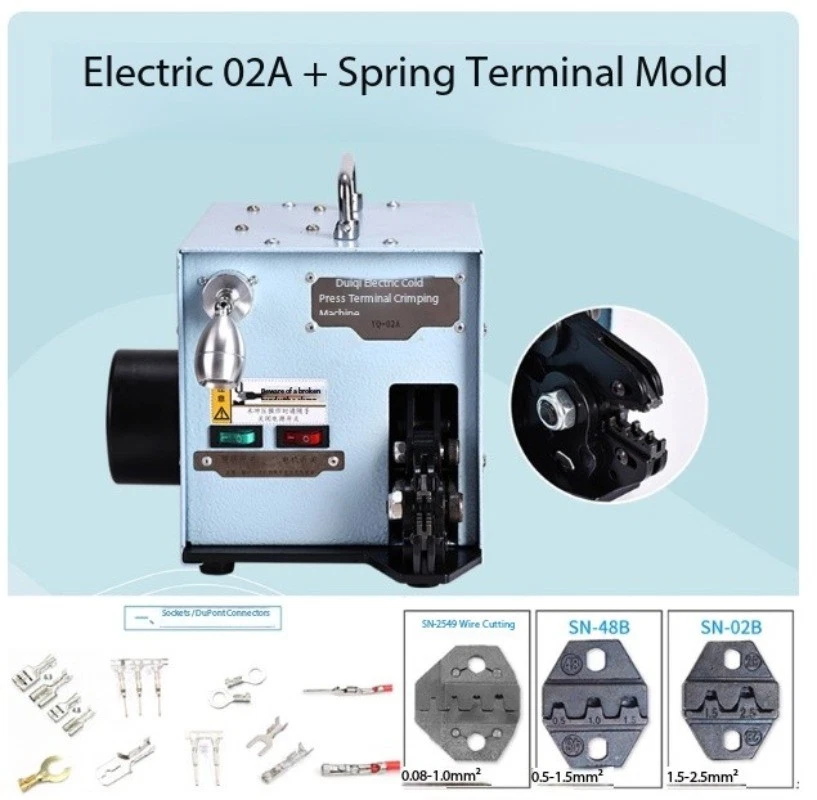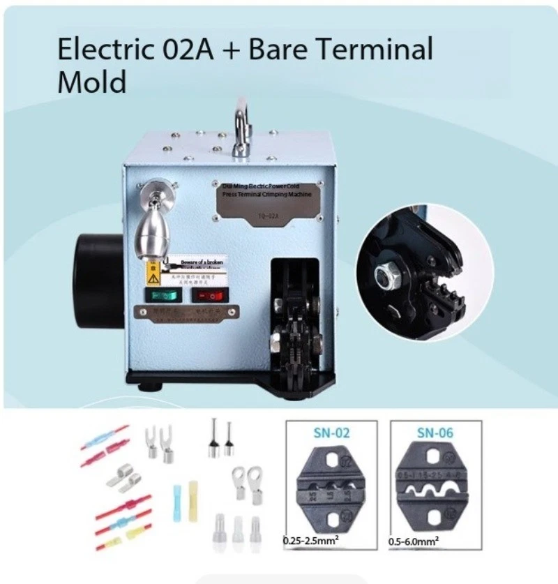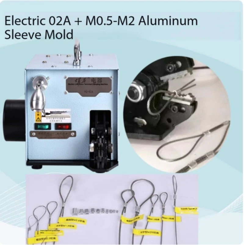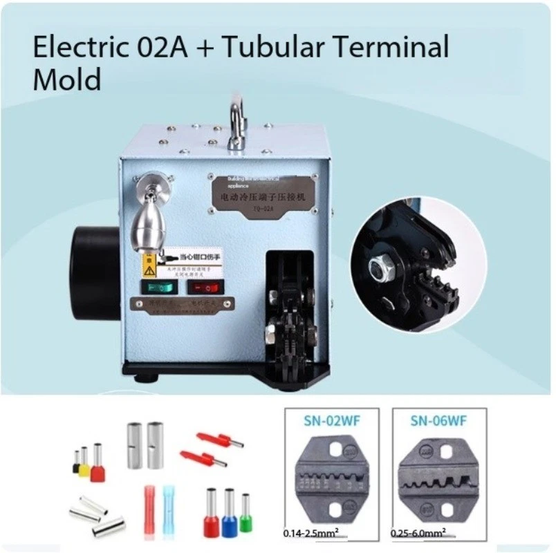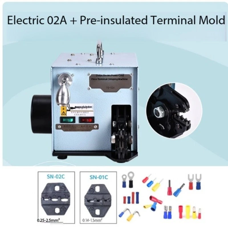 Pure Electric Silent Cold-Press Terminal Crimping Machine Tube-Type Terminal Clamp Electrician's Specialized Wire Crimping Pliers Wire Crimping Machine Model : YQ-02A Input Voltage: AC 220V, 50Hz Motor Power: 60W Motor Speed: 50 rpm Crimping Speed: Single crimp: 1 sec/cycle, Continuous crimping: 2 sec/cycle Mold Socket Thickness: 4mm Overall Weight: 12 kg Dimensions: W 236mm × H 218mm × L 290mm