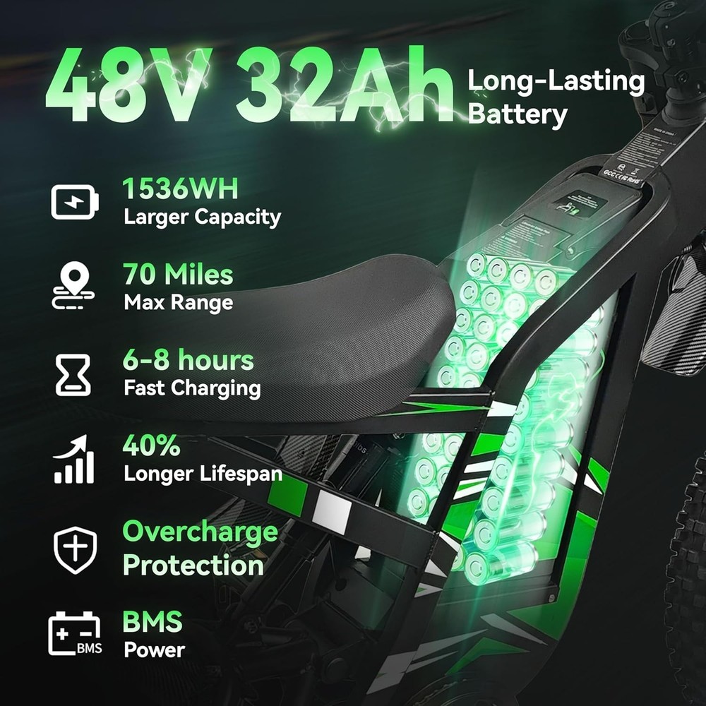 [๐๐ซ๐๐ฆ๐ข๐ฎ๐ฆ ๐๐๐ซ๐๐จ๐ซ๐ฆ๐๐ง๐๐ ๐๐๐๐๐ ๐๐๐๐ค ๐๐จ๐ฐ๐๐ซ] The D01 electric dirt bike is equipped with a peak 4000W brushless motor, unleashing exhilarating power that propels it to a 40mph (64km/h) and tackling 45ยฐ slopes effortlessly. Riding the ebike isn't just cyclingโit's taming a roaring beast, tearing through the wild with wind howling in your wake: fearless, unyielding, utterly unstoppable. ใ๐๐๐ ๐๐๐๐ก ๐๐๐ฆ๐จ๐ฏ๐๐๐ฅ๐ ๐๐๐ญ๐ญ๐๐ซ๐ฒ ๐ฐ๐ข๐ญ๐ก ๐๐๐๐ข๐ฅ๐๐ฌ ๐๐๐ฑ ๐๐๐ง๐ ๐ใPowered by a 48V 32Ah high-capacity removable battery, this electric motorcycle delivers an impressive max range of 70 miles on a single charge (4.5A Fast Charger: 6-8 Hours Full Charge)-enough to handle daily commutes, weekend getaways, or even cross-town adventures without the stress of range anxiety. ใ๐๐ข๐ซ๐ญ ๐๐ข๐ค๐ ๐๐ข๐ซ๐๐ฌ & ๐๐ฒ๐๐ซ๐๐ฎ๐ฅ๐ข๐ ๐๐ซ๐๐ค๐๐ฌใThe electric bike features 70/100-19 knobby fat dirt tires specialized for motocross bikes, delivering exceptional traction and stability on all terrain. The braking system adopts 180mm dual-disc hydraulic brakes with 4-piston calipers, delivering instant, linear braking force even at high speeds or on slippery surfaces, effectively shortening braking distance for maximum safety. ใ๐๐ฅ๐ฅ-๐๐จ๐ฎ๐ง๐ ๐๐ข๐ฌ๐ข๐๐ข๐ฅ๐ข๐ญ๐ฒ & ๐๐ฆ๐๐ซ๐ญ ๐๐ข๐ฌ๐ฉ๐ฅ๐๐ฒ ๐๐ฒ๐ฌ๐ญ๐๐ฆใThe adults electric bicycle features a comprehensive riding support setup for safety and convenience. Intelligent LCD dashboard clearly displays speed, battery level, etc, and supports quick unlocking via NFC card. It also has bright LED front headlights, rear taillights and turn signals to keep you visible in low light or bad weather, keeping you informed and seen whether riding at night or in busy areas. ใ๐๐ซ๐จ๐๐๐ฌ๐ฌ๐ข๐จ๐ง๐๐ฅ-๐๐ซ๐๐๐ ๐๐ฎ๐๐ฅ ๐๐ฎ๐ฌ๐ฉ๐๐ง๐ฌ๐ข๐จ๐งใThe ebike features a dual suspension system paired with a thru-axle front fork, delivering strong rigidity and reliable locking force.It prevents wheel deviation during hard cornering or impacts, ensuring precise tracking and direct control. The dual suspension absorbs shocks from bumps and uneven terrain in real time, bringing you an ultra-smooth and comfortable riding experience on any road condition. ใ๐๐ฎ๐ฉ๐๐ซ๐ข๐จ๐ซ ๐๐-๐ฆ๐จ๐ง๐ญ๐ก ๐๐๐ซ๐ซ๐๐ง๐ญ๐ฒ & ๐๐/๐ ๐๐ง๐ฅ๐ข๐ง๐ ๐๐ฎ๐ฉ๐ฉ๐จ๐ซ๐ญใThe electric dirt bike comes with a 12-month quality support. To ensure smooth after-sales service, please retain the original packaging. Whether you have inquiries about use, need help with issues, or require after-sales guidance, we're 24/7 online to respond promptly, so you can ride with total peace of mind. Package Included: Ebike*1, Battery*1, Charger*1, Installation Tools*1, User Manual*1, NFC Cards*2, Remote Control*2 Note: Our products have been certified under UL2849 safety standards.