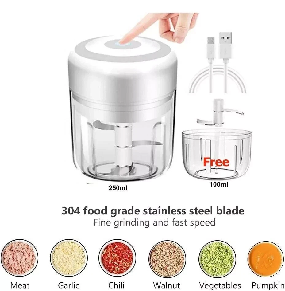 Electric Garlic Chopper, Mini Portable Veggie Chopper, 250ML Garlic Grinder Masher Onion Chopper, Blender to Vegetable, Wireless Food Processor for Ginger, Chili, Fruit, Meat, etc About this item 【Easy Use & Powerful】: Product size: 3.94'' * 4.53''. Just manually put food or ingredients into the 60W powerful vegetable chopper, lock the lid and chop food quickly with one button, garlic chopper with 4 stainless steel 304 sharp blades, only needs 20s can automatic and evenly chop/mince/blend a wide variety of foods, saving you time and freeing your hands. 【USB Charging & Portable】: The rechargeable electric garlic chopper supports USB charging, handheld Cordless mincer can be used about 50 times after full charged. This 350ml portable food processor features compact volume, and satisfied the needs when traveling or camping. 【Easy Clean & IPX65 Waterproof】: Our 350ml large capacity food chopper can be rinsed directly with water after use, the blender cup and blade are detachable, no stain residue, making cleaning and assemble are simply, fully clean after a flush, and ready for the next challenge. 【Health & Safety】: This garlic press is made of BPA free harmless to the health of your family food-grade material. The magnetic safety lock will automatically stop chopping when the lid and bowl are not attached to prevent scratches and food splashing.