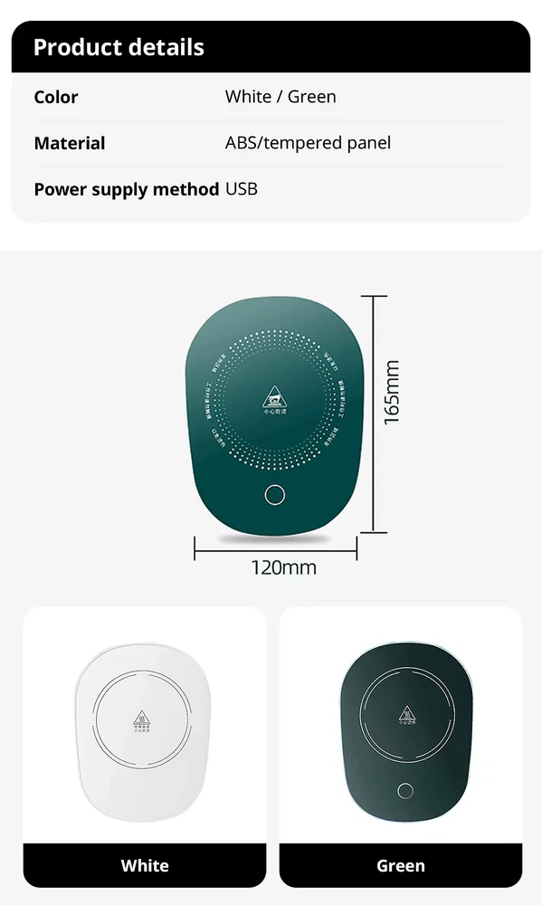 Title Options (80 characters max): "Electric Heated Coffee Mug Warmer Pad with USB - Smart Thermostatic Coaster" "55°C USB Heating Coaster for Coffee, Tea, Milk - Compact Smart Warmer Green" "1PCS Smart Thermostatic Coffee Warmer Pad USB Powered Heating Coaster" "Portable USB Coffee Mug Warmer Mat - Smart Thermostatic Green Coaster" "Eco-Friendly Electric USB Coffee Warmer Coaster for Home & Office Use" Description: Keep your beverages warm and ready to enjoy with the Electric Heated Coffee Mug Warmer Pad . This smart thermostatic heating coaster is perfect for home, office, or on-the-go use, ensuring your drinks stay at the ideal temperature. Key Features: Electric Heated Design: Maintains a consistent beverage temperature for an extended period. Smart Thermostatic Function: Automatically regulates heat, keeping your drink warm at 55°C. Eco-Friendly Material: Made with high-quality plastic and tempered glass, safe for daily use. USB-Powered Convenience: Easily power the heating pad via USB, ideal for schools, dormitories, and offices. Versatile Compatibility: Suitable for stainless steel cups, ceramic mugs, baby bottles, and more. Compact and Portable: Lightweight and easy to carry, perfect for busy lifestyles. Durable Construction: Built to last with robust materials for everyday use. Specifications: Product Name: 55°C Heating Coaster Power Supply: USB power Material: Plastic + Tempered Glass Size: 16 x 12 cm Color: Green Package Includes: 1 x USB-Powered Heating Coaster (Cup not included)