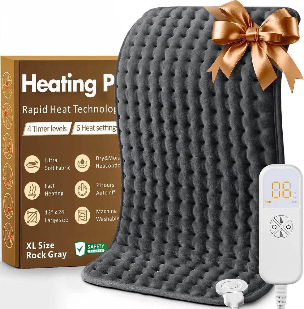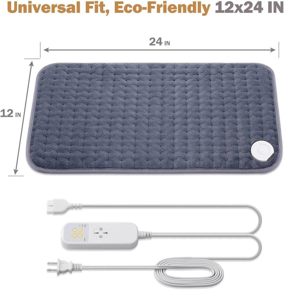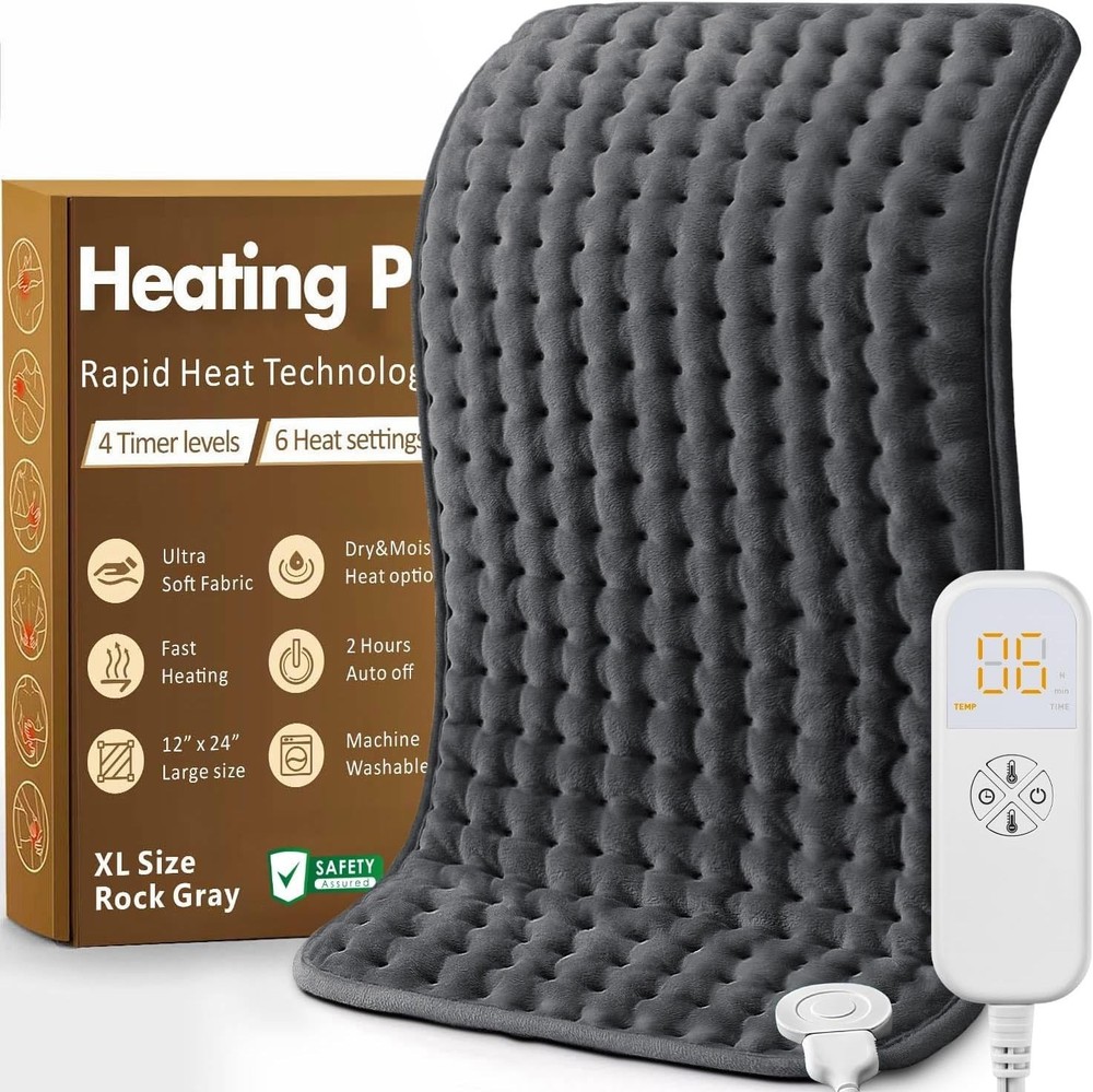 Material: Fabric, Soft Material, Skin-Friendly Material, Plush Material Color: Rock Gray Package Dimensions: 12.32 X 8.31 X 2.28 Inches; 1.41 Pounds Material Type: Rock Gray Department: Unisex Type: Electric Heating Pad Number Of Settings: 6 Power Source: Electric Size: 12"x24" UPC: Does not apply Features: With Temperature Settings, Auto Shut Off, Moist Heat Option, Dry Heat Option, Machine Washable, 6 Heat Settings, Preset Timer Settings, Power Cord Length 7 Feet gtin13: Does not apply Brand: Unbranded