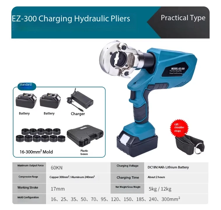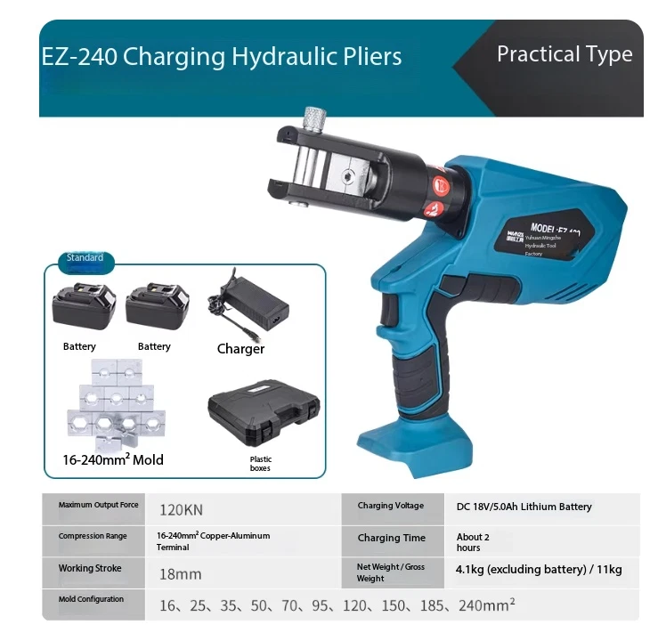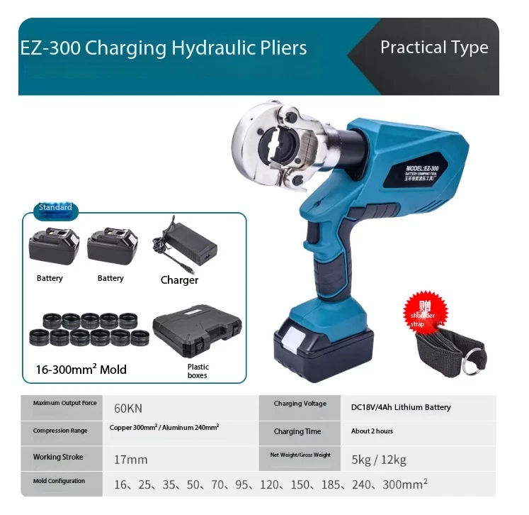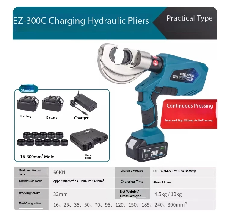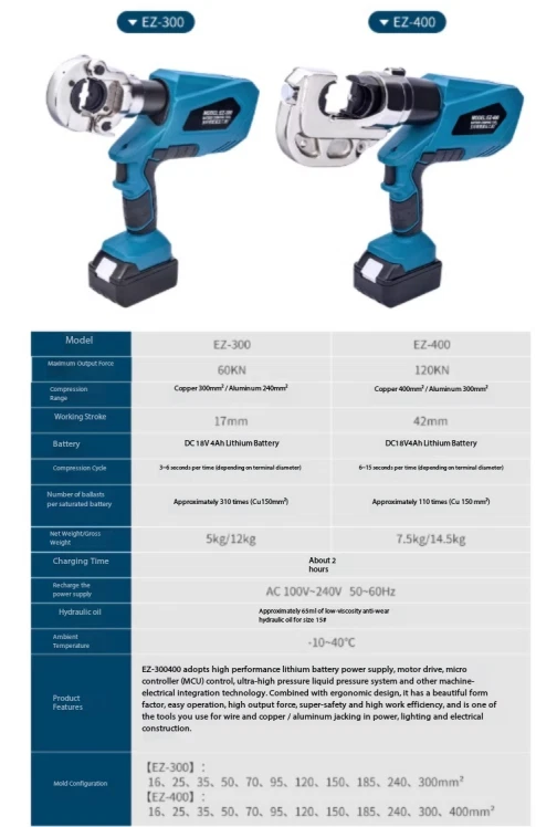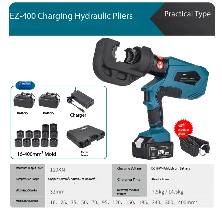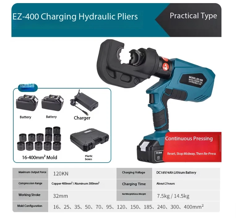 Electric Hydraulic Crimping Pliers Rechargeable Crimping PliersTerminal Crimping EZ-400 Maximum Output Force: 120 kN Crimping Range: Copper 400 mm² / Aluminum 300 mm² Working Stroke: 32 mm Die Configurations: 16, 25, 35, 50, 70, 95, 120, 150, 185, 240, 300, 400 mm² Charging Voltage: DC 18V / 4Ah battery Charging Time: Approx. 2 hours Net Weight / Gross Weight: 7.5 kg / 14.5 kg