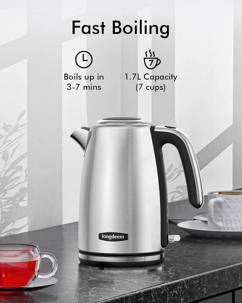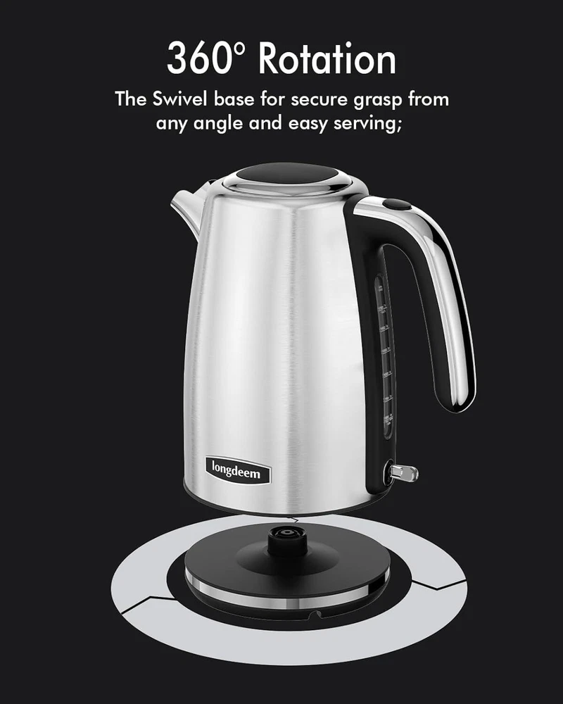 Product Description Electric Kettle Stainless Steel 1.7L - 1500W Quick Boil, Retro Style, Auto Shut-Off, Boil Dry Protection with Filter & Water Gauge - Perfect for Tea, Hot Water QUICK BOILING--Set out with a hot cup of tea, thanks to the Electric Kettle Retro Series. It packs a 1500W punch, boiling 1.7 liters of water within minutes. Simply fill, switch, and wait. RELIABLE QUALITY--Featuring a fast-heating boiler and components made of food-grade stainless steel. Its handle remains cool to prevent burns and its matte finish is dust-repellent. SAFETY FIRST--Designed with an automatic shut-off and boil-dry protection, ensuring safe use. It self-regulates, shutting down once the water boils or if it's running empty. COUNTERTOP CHARM--Complement your kitchen with our award-winning kettle design that combines style and functionality. Offers easy serving via the 360° swivel base and thorough cleaning with a removable anti-scale filter. The water level gauge is conveniently placed for both left and right users. CUSTOMER SATISFACTION--Purchase with confidence, knowing you have the backing of our excellent customer service and a 2-year assurance protecting against material and workmanship defects. About Us We are a reputable seller with many years of experience selling on eBay. Our goal is to provide high-quality products and excellent customer service. Shipping Items will be shipped within 1-3 business days when we received payment. (Orders are not processed on weekends & holidays) Tracking information will be sent once item is shipped. Delivery time depends on destination and other factors Item is shipped to ebay address. Leaving correct address can minimize delay. For international shipping and shipping to Guam, Hawaii and Alaska, Please contact us before placing the order. International buyers please note: Import duties, taxes and charges are not included in the item price or shipping charges. These charges are buyer’s responsibility. We will try our best to reduce the risk of the custom duties. Local pick-up is unavailable at the moment. Contact Us We reply any email messages within 1 business / working days(off-duty at weekend). If you do not get a response from us, then please check your junk or spam mailbox. Our Business hours: Mon-Fri 9:00-18:00, UTC/GMT +8 hours. Please contact us either by clicking "contact seller" in the "purchase history" section or simply click "ask a question" at the bottom of this page. If you are unsatisfied with our item or service, please contact us before leaving any feedback. We are committed to resolve all issues in a friendly and satisfactory manner.