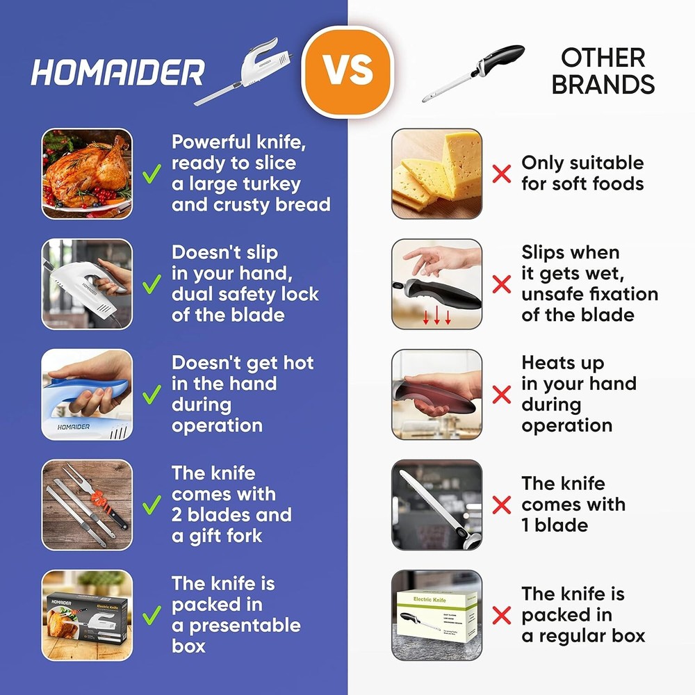 Electric Knife for Carving Meat, Turkey, Bread & More. Serving Fork and Carving Blades Included πͺ FAST & EASY SLICING: Electric Knife allows you to make perfectly even slices fast and without having to apply much pressure or sawing motion! Improved inches( m) extra-long cable allows you to slice your products in a convenient place! The lightweight design of the electric knife makes it easy to hold with one hand. Enjoy your perfect slices regardless of your age! π HIGH QUALITY & ERGONOMIC DESIGN: Electric Carving Knife features an ergonomic handle for comfortable product handling and easy meat, bread, fish, cheese, large vegetables & fruits carving. The two precision stainless steel blades included with the Electric Knife package are strong, durable and designed to last. The removable blades are dishwasher-safe for fast and easy cleanup! π LOW NOISE & VIBRATION: Clever product design provides you with all the power needed to easily and quickly carve through the meats, bread and more without excessive noise and vibration! π‘ DUAL SAFETY LOCK: A specially designed safety lock feature keeps the blade locked in place to avoid accidental activation and to ensure your safety. Electric Knife is ETL certified and fully safe to use! β BASED CUSTOMER SUPPORT: Each Product includes a 1 Cover provided by in addition to the s satisfaction or timeframe.