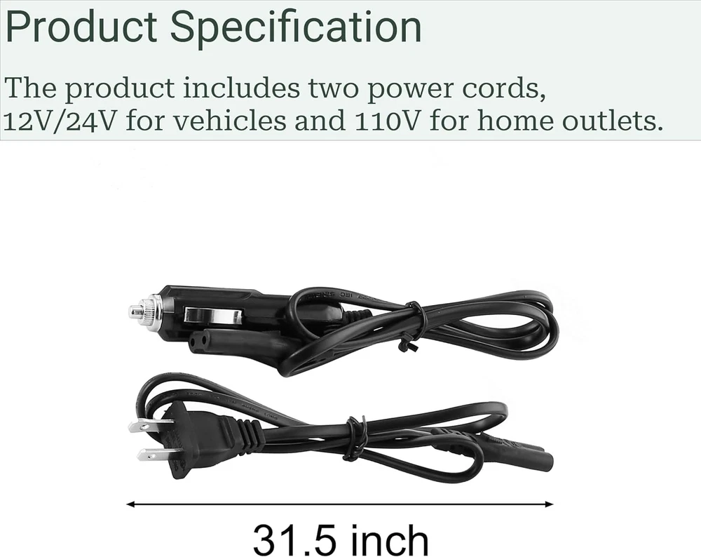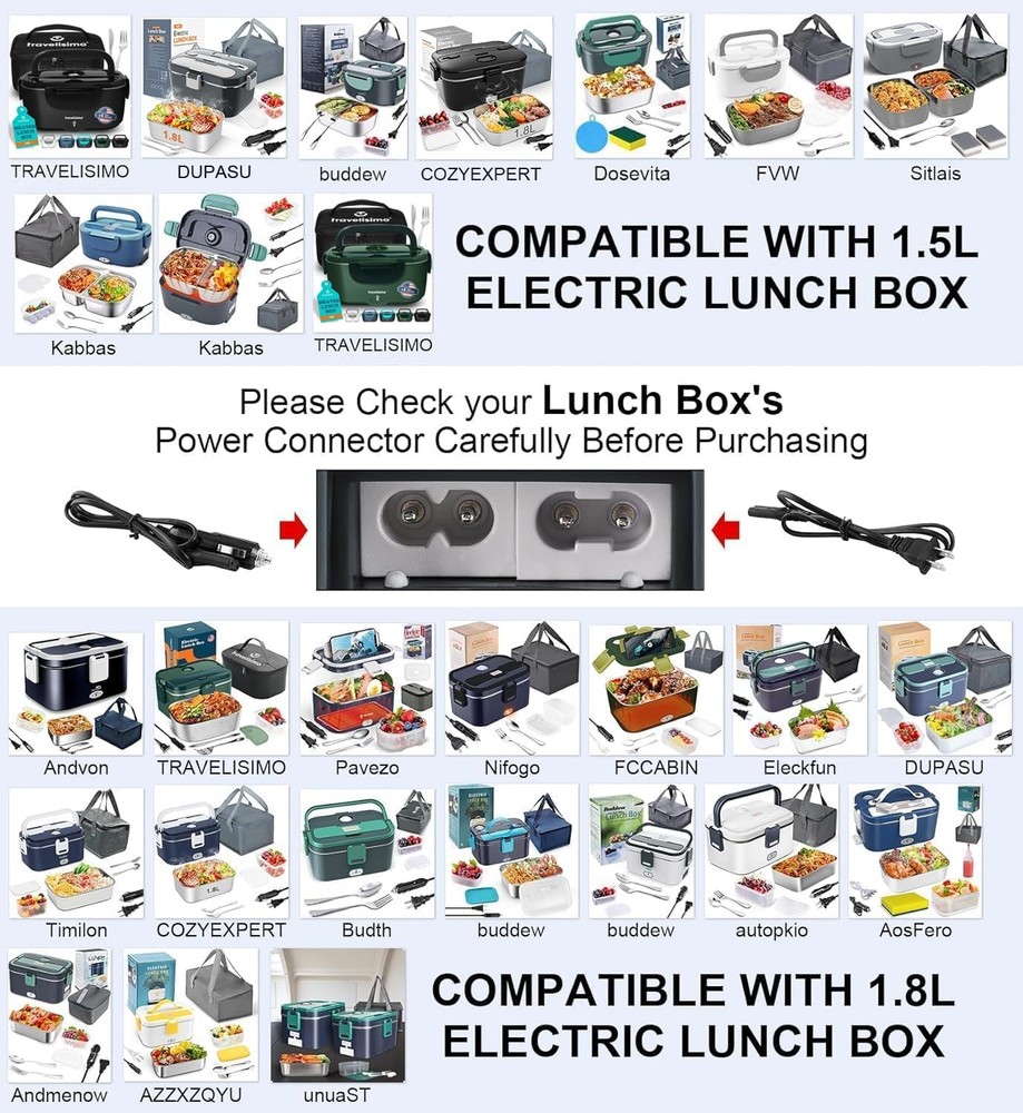 Electric Lunch Box Power Cord Set This power cord set is specially designed for electric lunch boxes, providing versatile charging solutions for different scenarios. The package includes two high-quality power cords: one 12V/24V car power cord and one 110V socket power cord, catering to your diverse needs. The 12V/24V car power cord is perfect for on-the-go use. It connects to the flat bottom interface of your electric lunch box, allowing you to heat your meals conveniently while driving. Whether you're commuting, traveling, or on a road trip, this cord ensures your lunch is ready to enjoy whenever you need it. The 110V socket power cord is ideal for indoor use. It is designed to connect to the V-shaped interface of your electric lunch box, making it easy to plug into standard wall sockets at home, in the office, or elsewhere. This gives you the flexibility to use your electric lunch box in various indoor settings. Compatibility Note: To ensure a proper fit, please confirm the interface type of your electric lunch box with the product images before purchasing. You can also select based on the brands provided in the product images to compatibility. This way, you can be confident that our power cord set will work seamlessly with your electric lunch box. With this power cord set, you'll never have to worry about being unable to power your electric lunch box. It offers convenience and flexibility, making it an essential accessory for your electric lunch box. Order now and enjoy the convenience of having your meals heated wherever you are! NOTE: Please check the product picture carefully before purchase, and compare with your old power cord to see if it is compatible with your electric lunch box COMPATIBILITY : Compatible with most four-socket electric lunchboxes, but some brands may require verification.Before purchasing, please double check the shape of your bento box's power connection to ensure that your bento box's flat bottom connector connects to an on-board (12/24 V) power cord and the V-shaped connector connects to a 110V outlet power cord to ensure seamless compatibility with our products Heated Lunch box power supply: This special power cord is designed for electric lunchboxes and ensures a reliable power supply. Suitable for both 12 V-24 V car sockets and standard 110 V domestic sockets, it's a versatile solution for your meals on the go or at home PRODUCT DETAILS:The package includes two 32-inch power cords for flexibility in adapting to a variety of power sources. Whether you're on the go or at home, we have a complete power solution for you EFFICIENT HEATING: Our power cords support up to 100 W of power, ensuring that your electric lunchbox heats up quickly and efficiently. You can prepare meals faster and enjoy your lunchtime