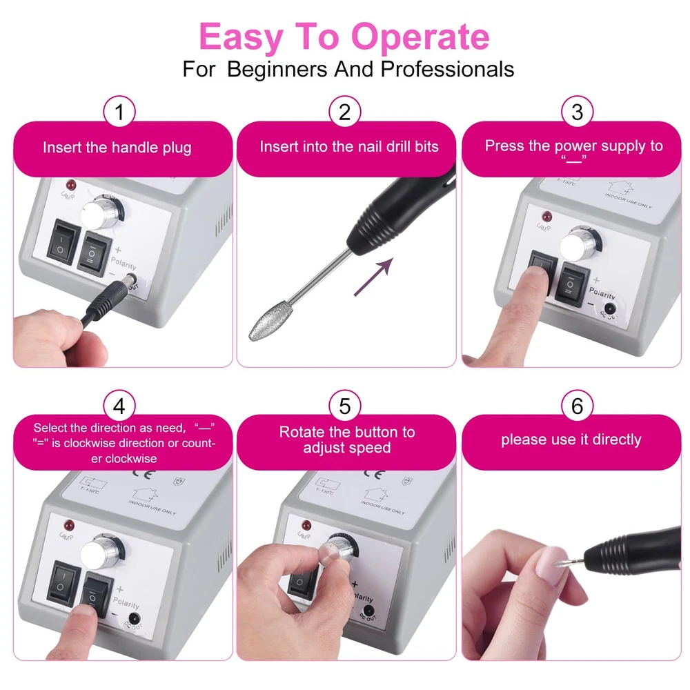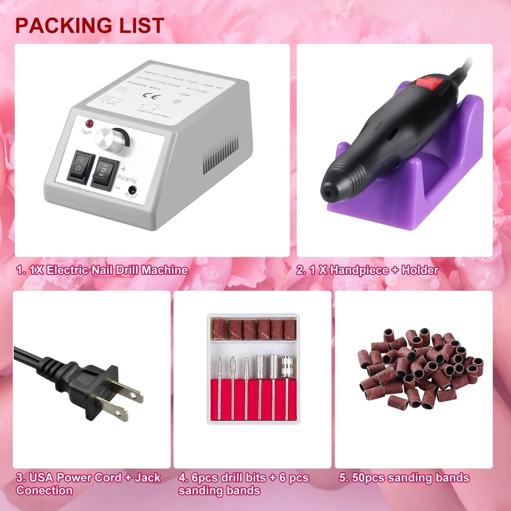 Professional Manicure Pedicure Kit: with 6 optional standard metal bits and 100pcs Sanding Bands Low noise and slight vibration when smooth your nail,great for manicure,pedicure, engraving,filing,shape,polish,remove callus,or pets nail beauty Easy Use & Saving and Convenient This Electric Nail Art Drill Machine allows the technician flexibility and can get the job done in much less time and in a much more efficient manner with on/off switch. is perfectly used in spas, beauty parlors as well as personal use in homes. Specification Material: Metal Item Weight: 0.60kg Item dimension: 130*85* 60mm Input Voltage:100V-110V AC Output Voltage: 0-17V DC Power Max:10W-12W Packing List 1 x Nail Drill Machine ( with Manual ) 1 x Handpiece 1 x Table Stand 6 x Drill Bits 100 x Sanding Bands About Customer Service 100% Customer Satisfaction Guarantee. If you are not satisfied with our product, we will resend or refund for you. 7 * 24 hours,we are alway here to help. Made of High Quality Metal for Multiple Uses -- Carving, engraving, routing, grinding, sharpening, sanding, polishing, even carving deep into the glass, without the drill or converter overheating. Speed Adjustable, Speed Up To 30,000 rpm -- It is LOW NOISE and smooth, very low vibration design for comfort grip. Low noise and vibration for smooth and long-time operation. With All Extra Heads And 1 bag of 50 Pcs Sanding Bands -- This new Electric Nail Art Drill Machine is perfectly used in spas, beauty parlors as well as personal use in homes. Please Kindly Noted Below Tips, It Might Help You -- it could overheat if you run it too long.Avoid overheating for continuous polishing in long time which may cause the machine got shock. Works Great for DIY Acrylic Nails, Regular Polish, Gel Polishes -- This will help me to save money and do my nails at my convenience at home. If any question, just let us know freely, we are always here to help.
